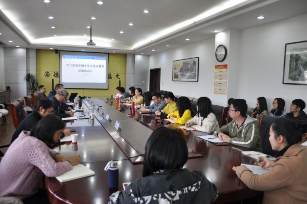 在学院楼208会议室召开2019级春季博士生见面会暨新学期座谈会,院长杨云霞,院党委书记鲁卫平,副院长郝保权,博士点负责人秦燕教授,研究生班主任曹瑜副教授以及全体博士生出席了此次见面座谈会。会议由郝保权副院长主持。