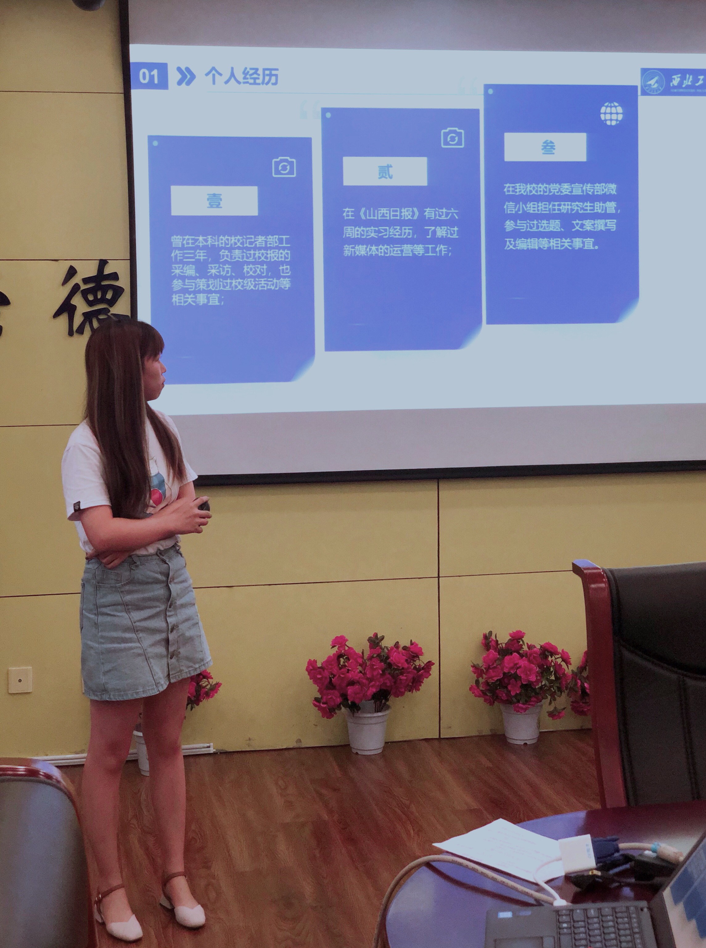 任静从她参与的往期活动、工作计划和竞选目的三方面进行答辩。她总结了前期参加的主题团日活动和社会实践活动,在之后的工作规划中她提出要加强团队内部组织建设、继承弘扬研究生会的优良传统以及改进当前工作中的不足。