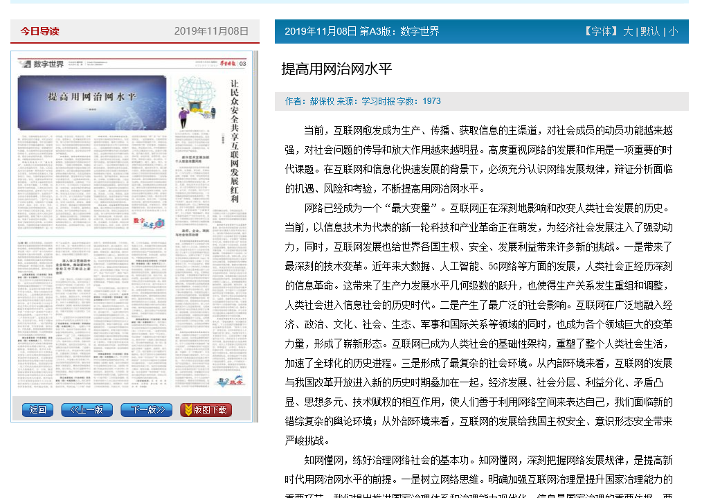 教授在中央内参《学习时报》发文:从四个方面提高用网治网水平。《学习时报》1999年9月创刊,中共中央党校主办,面向全国,服务全党,以各级党政干部和广大知识分子为主要对象,是国内外公开发行的全党唯一专门讲学习的报纸。