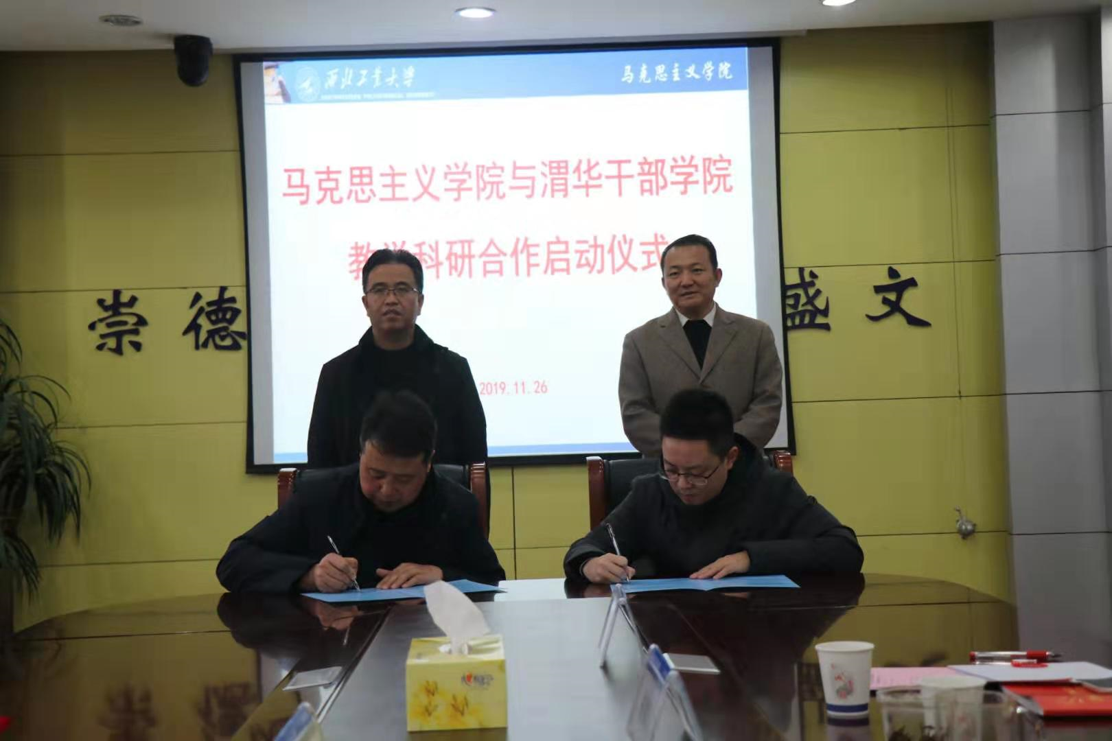马院与渭华干部学院建立合作,拟在五个方面达成合作协议:一是在课程研发方面,西工大马院为渭华干部学院提供人才培养和智力支持,组建相关课题研发组3到4个,对渭华起义革命精神的深刻内涵、历史意义以及时代价值进行在挖掘在发展。二是签约西工大马院相关领域兼职教授3到5名,三是在渭华干部学院设立西工大马克思学院学生社会实习实践基地,一方面可以不断挖掘历史资源另一方面可以提高学生社会实践能力。四是通过各高校德育课程平台和共同打造学术论坛,深化对渭华精神的研究与传播发展。五是双方建立长期沟通交流机制。