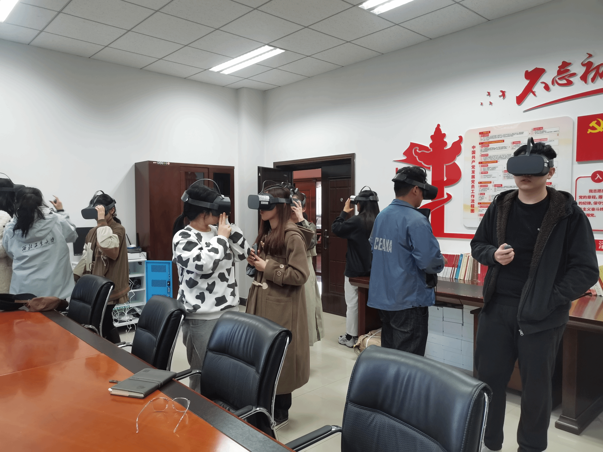 会议结束后,支部党员和入党积极分子参观了学院党建活动室,并利用由学校组织部牵头,联合学院共同建设的党建VR活动室的相关设备进行沉浸式学党史体验,通过视觉、听觉等全方位立体化的运用,在沉浸式、互动式的红色文化学习体验中,让大家共同感受红色力量、传承红色精神。这种“身临其境”的党课方式增强了同志们主动学习理论知识的积极性和自觉性,达到了良好的学习效果。
