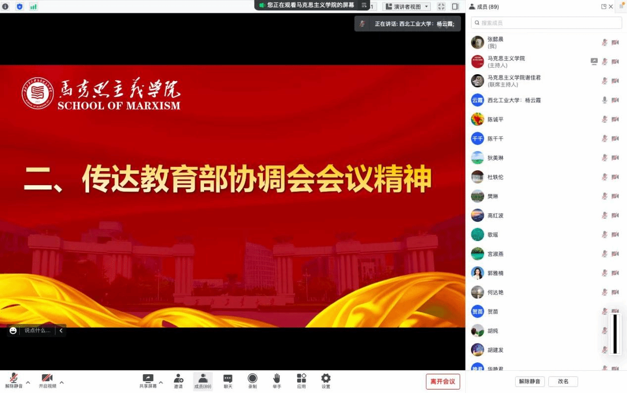 院长杨云霞传达了教育部协调会会议精神,指出,讲好《习近平新时代中国特色社会主义思想概论》(以下简称《概论》)课程是政治任务,学院的领导班子成员要把《概论》课建设作为未来工作的重中之重;《概论》课的教学要提高标准,并加强教学研究、一体推进;《概论》课具有综合性强、实践性强、政策性强的特点,各位老师要高度理论联合实际;要全面落实达标行动,开展好自查评估,查短板补弱项,坚持问题导向,确保上好、讲好《概论》课。
