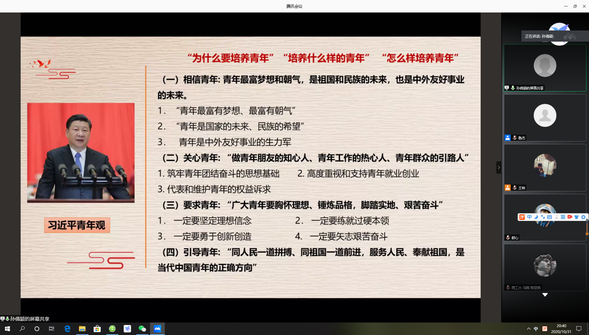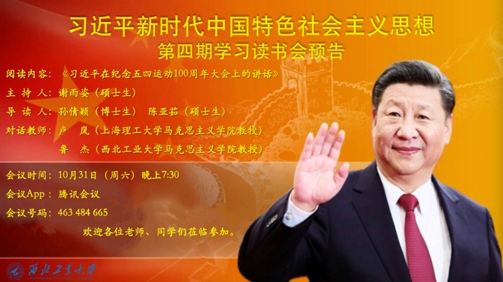 于2020年10月31日晚7:30举办了习近平新时代中国特色社会主义思想学习读书会第四期交流活动,本次读书会主题主要围绕《习近平在纪念五四运动100周年大会上的讲话》进行展开。此次活动由国产直播