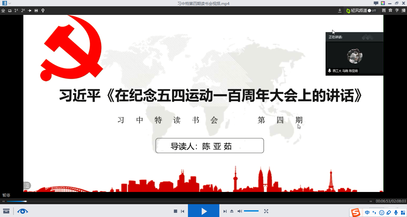 硕士生陈亚茹同学进行导读,她具体谈到,要把五四运动放到中华民族5000多年文明史中、中国人民近代以来170多年斗争史中和中国共产党90多年奋斗史中这三个方面去认识和把握,这样我们才能理解习近平总书记为什么将五四运动概括为伟大爱国革命运动、伟大社会革命运动、伟大思想启蒙运动和新文化运动,因为从任何一个方面单一地去认识五四运动,都会犯以偏概全的错误,都无法准确把握五四运动的丰富内涵。国产直播