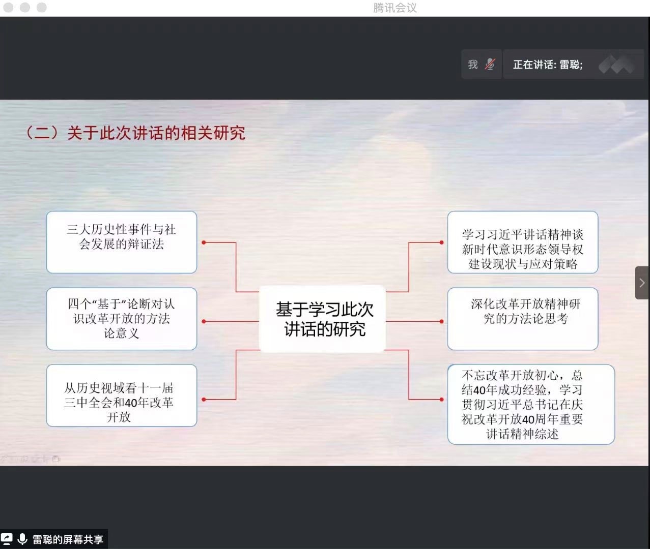 硕士生雷聪进行导读,她具体分析谈到为什么我们党作出改革开放的历史性决策和对改革开放的评价、三大里程碑以及十个“始终坚持”等内容做了详细的分析与梳理,重点解读了《习近平在庆祝改革开放40周年大会上的讲话》中所提到的四个“基于”,最后她还提出了自己的相关思考与问题。紧接着由国产直播