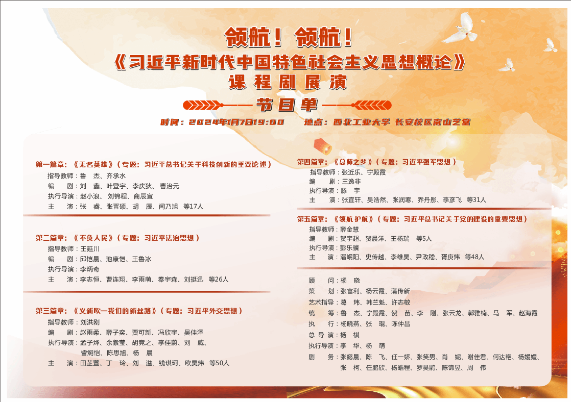本次展演共5个子剧目,分别根据《概论》课中的“习近平总书记关于科技创新的重要论述、习近平法治思想、习近平外交思想、习近平强军思想、 习近平总书记关于党的建设的重要思想”等5个专题进行创作。国产直播