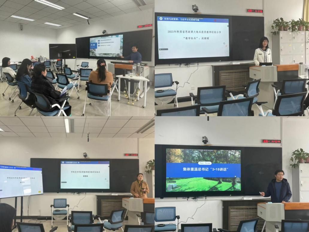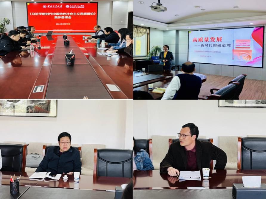 《习近平新时代中国特色社会主义思想概论》课程组于3月19日下午,线下组织召开了“习近平总书记思想政治理论课教师座谈会五周年”主题集体备课会。会议由思想政治教育系副主任宁殿霞主持。首先,由张淑华副教授简要介绍本科评估整改的工作,着重传达了关于“总师育人文化”融入思政课的重要性,并动员各位教师积极参报课程建设项目。接下来,2023年陕西省思政课大练兵“教学标兵”宁殿霞进行教学展示,以“高质量发展——新时代的硬道理”为题从历史维度、理论维度、现实维度分别阐述了为什么要推动高质量发展、什么是高质量发展以及新时代十年高质量发展的成效。接着,近期在学院官网【强师德·铸师魂】专栏推介的吕焰助理教授就思政课比赛方面的创新性,经验等进行分享汇报。他指出,思政课教师应注重在日常教学中提升自己的教学质量,可采取发放问卷的形式进行学情前调,采用图表、数据等方式把教材学理性内容变成学生易接受的方式等。最后,相关思政课教师分别就各自所讲专题分享了自己在备课与讲课过程中的心得感受。