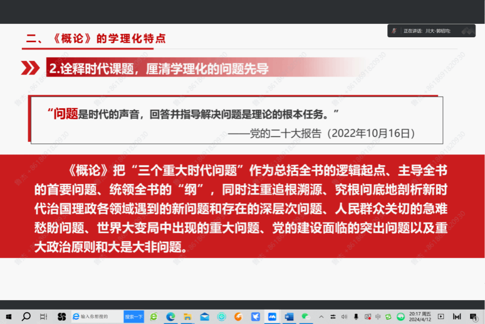 郭绍均谈到,习近平新时代中国特色社会主义思想是一个逻辑严密、内涵丰富、系统全面、博大精深的科学体系。教材学理化有四点,第一点阐述了理论基础牢固是遵循学理化的重要依托,马克思主义是魂脉,是学理化的原理基础和根本前提;中华优秀传统文化是根脉,是学理化的宝贵资源和深厚滋养;学科交叉的范式是学理化的必要路径和重要支撑。第二点是诠释时代课题是厘清学理化的问题先导。第三点是把准分析视域是用好学理化的认知路径。第四点是阐明理论贡献是拓展学理化的多维比较。