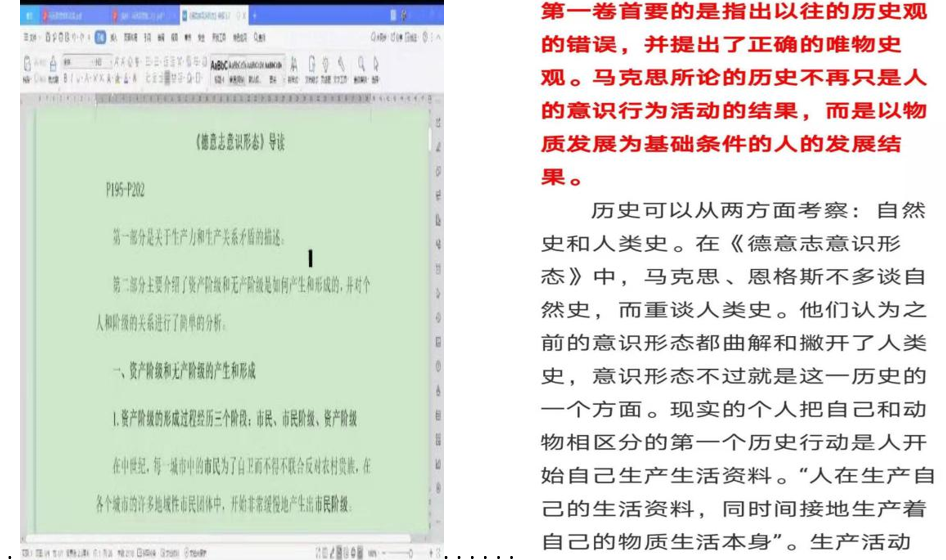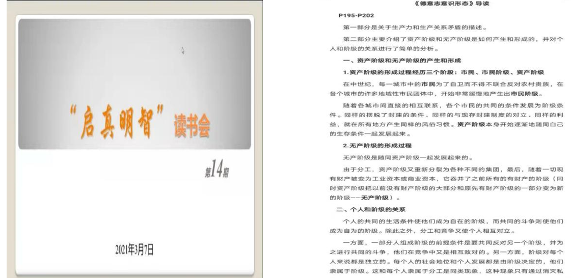 在读书会开始,田瑞青同学对大家表示了热烈的欢迎,并就参加读书会的各位老师进行了介绍,随后介绍了读书会的流程。黄清涛和周家欣同学对该部分内容做了简要的分析与梳理,所读部分主要介绍了生产力与交往形式之间的关系。