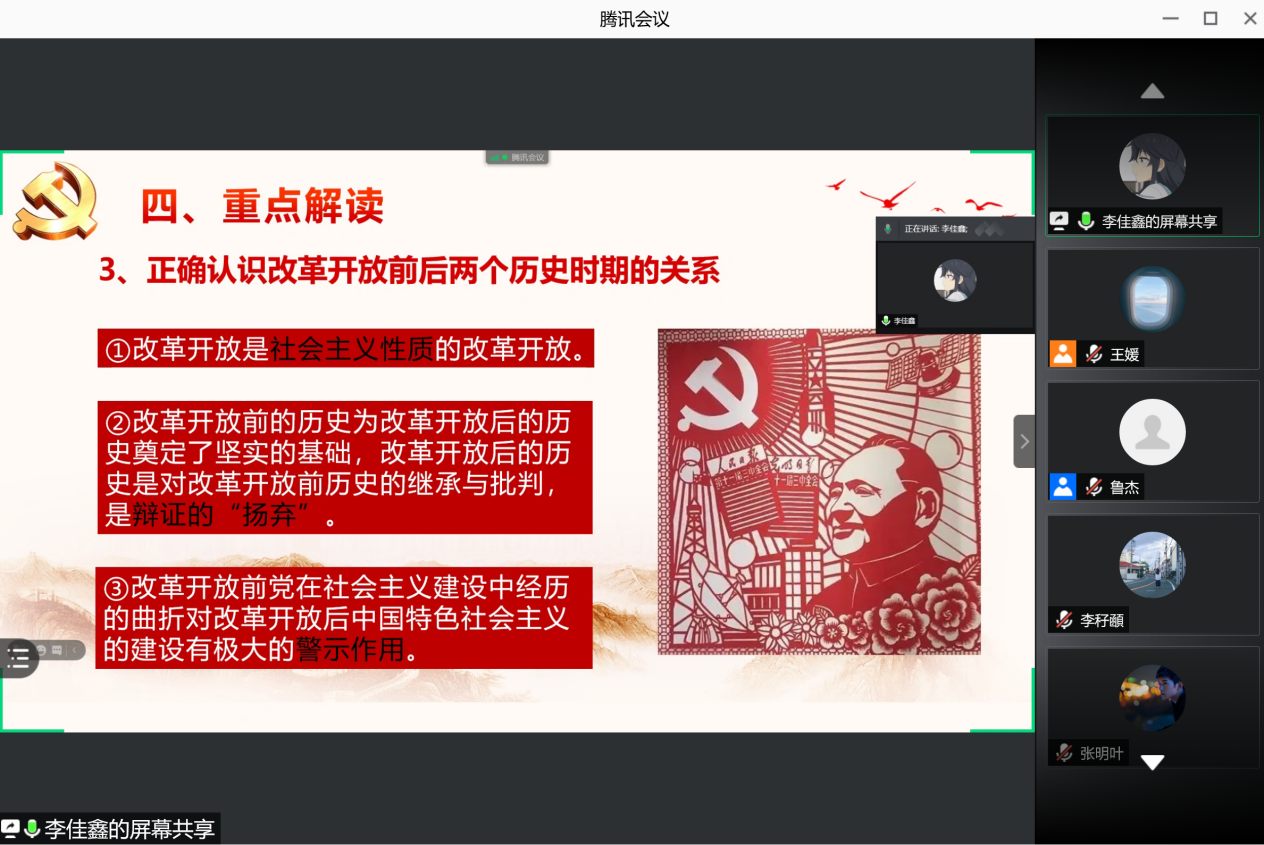 硕士生马园园同学。首先,她对文本的背景进行解读。她认为,在中华人民共和国成立70周年之际,本篇文章重新刊登,再次发出坚持和发展中国特色社会主义的坚定申明,解决了党内存在的思想困惑以及国际社会的歪曲谬读;其次,从中国特色社会主义本质、改革开放前后两时期的关系,马克思主义理论的科学性与时代性、共产主义理想信念四个方面对文本内容进行解读;最后,阐明坚持和发展中国特色社会主义研究的思路与意义并提出问题思考;接下来,由学院博士生李佳鑫同学进行导读。首先,通过对文本出台背景的学习,她认为习近平总书记的讲话体现了党对“道路问题”的高度重视,蕴含着丰富的理论与实践价值。其次,她从中国特色社会主义的基本原则、改革开放前后两时期的比较、马克思主义与社会主义的深化发展、远大理想和共同理想等层面梳理出文本主要内容;第三,从理论逻辑、历史逻辑、现实逻辑三个层面对相关文献进行简要概括;最后,对文本进行重点解读。她认为,中国特色社会主义是解决时代课题的具体实践形式,改革开放前后的经验教训是建设和发展中国特色社会主义的宝贵财富,应当坚持和发展马克思主义,新时代共产党人要做到知行合一。