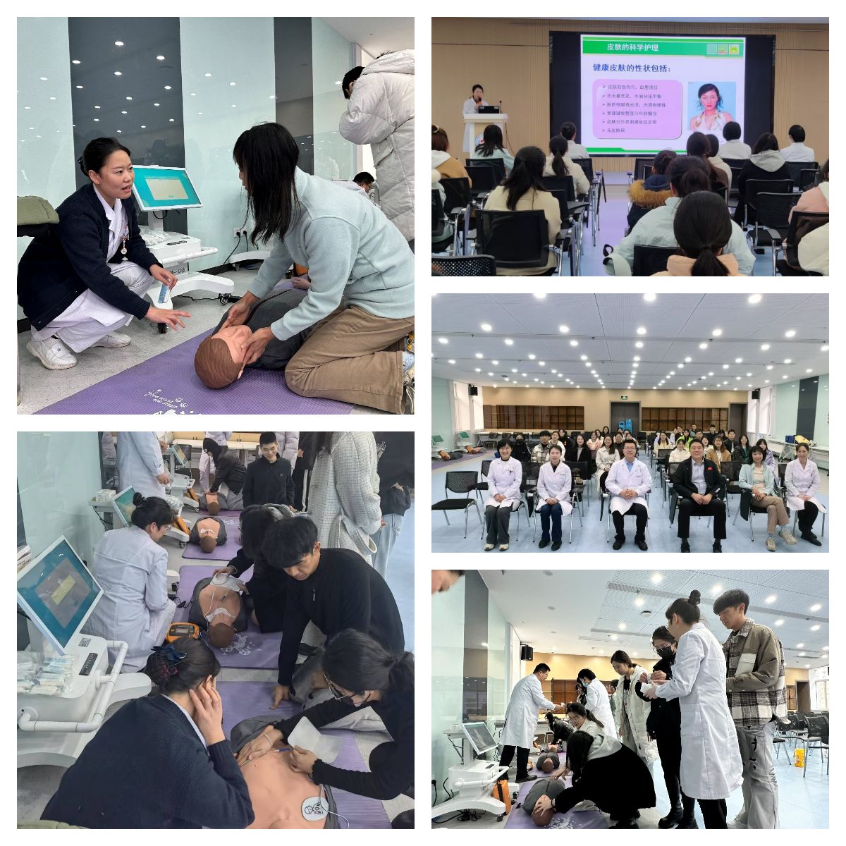 责任医师、副主任医师霍伟红老师主持,霍老师首先介绍了学校医院基本情况,并结合自身临床经验分享了秋冬季保养皮肤的方法。随后,校医院副院长何凯亮老师为大家带来了精彩的急救理论知识讲解。本次急救的理论培训主要包括心肺复苏术、海姆立克法解救气道异物、AED的使用等三个专题。何老师通过对比心搏骤停患者抢救案例及国内外抢救成功率,深刻指出了我国目前推广“全民急救”的紧迫性。何老师以生动语言、通俗易懂的培训形式对人体心脏供血原理、心肺复苏前注意事项、如何指挥周围人员协助拨打120、取用附近AED机、心肺复苏基本操作流程、AED设备使用步骤和注意事项等内容进行专业性讲解,并利用人体模型进行现场演示。