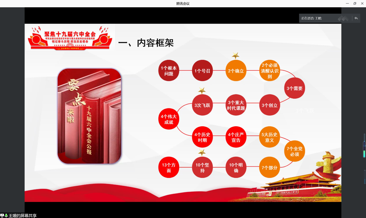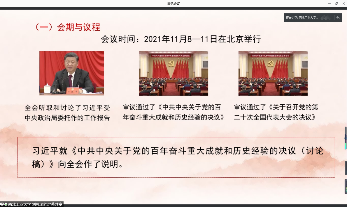 硕士生刘思源同学。他从四个方面展开:第一,党的十九届六中全会概况。全会充分肯定党的十九届五中全会以来中央政治局的工作、全会审议通过了《中共中央关于党的百年奋斗重大成就和历史经验的决议》、《中共中央关于党的百年奋斗重大成就和历史经验的决议》共七个部分、并阐述了六中全会核心要义、最大成就和重大意义。第二,《决议》与中共历史上前两个“历史决议”的比较。分别从五个方面论述了三次决议的异同与联系。一是为什么要总结党的百年奋斗重大成就和历史经验;二是前两个“历史决议”制定的历史背景和主要内容;三是前两个“历史决议”的历史作用和意义;四是《中共中央关于党的百年奋斗重大成就和历史经验的决议》提出背景;五是《中共中央关于党的百年奋斗重大成就和历史经验的决议》重大意义。其次,针对每个部分,阐述了具体内容,让大家进一步理解会议的主要内容和扩展意义。第三,《决议》的主要内容与创新提法。分别围绕五个层面表达了对于会议总体内容和创新之处的把握。第一层面,《决议》总结的百年奋斗的五个重大意义和十条历史经验:一百年来,党领导人民进行伟大奋斗,积累了宝贵的历史经验,这就是:坚持党的领导;坚持人民至上;坚持理论创新;坚持独立自主;坚持中国道路;坚持胸怀天下;坚持开拓创新;坚持敢于斗争;坚持统一战线;坚持自我革命;第二层面,《决议》指出的建党百年经历的四个历史时期完成的四件大事:不同时期有不同任务,在中国共产党的引领下,最终党领导人民自信自强、守正创新,创造了新时代中国特色社会主义的伟大成就;第三层面,《决议》指出的马克思主义中国化的“第三次”飞跃:无论是毛泽东思想,还是中国特色社会主义理论体系,到今天的习近平新时代中国特色社会主义思想,都实现了马克思主义中国化的一次又一次新飞跃;第四层面,《决议》聚焦新时代,总结了十八大以来党取得的十三个方面历史成就:这次决议聚焦总结党的百年奋斗重大成就和历史经验,突出中国特色社会主义新时代这个重点,总结了党的十八大以来,各个领域的原创性思想、变革性实践、突破性进展、标志性成果;第五层面,《决议》的突出亮点和重大贡献:提出“两个确立”,对习近平新时代中国特色社会主义思想进行了系统概括和阐述,是《决议》的突出亮点和重大贡献。最后,是专家学者对《决议》内容的解读。分别从三个方面列举出各专家对全会的解读,一方面是关于总结党的百年奋斗重大成就和历史经验的重大意义;另一方面是关于如何理解“中国共产党的百年奋斗”;最后是关于如何理解“坚持理论创新是中国共产党取得成功的基本经验”。