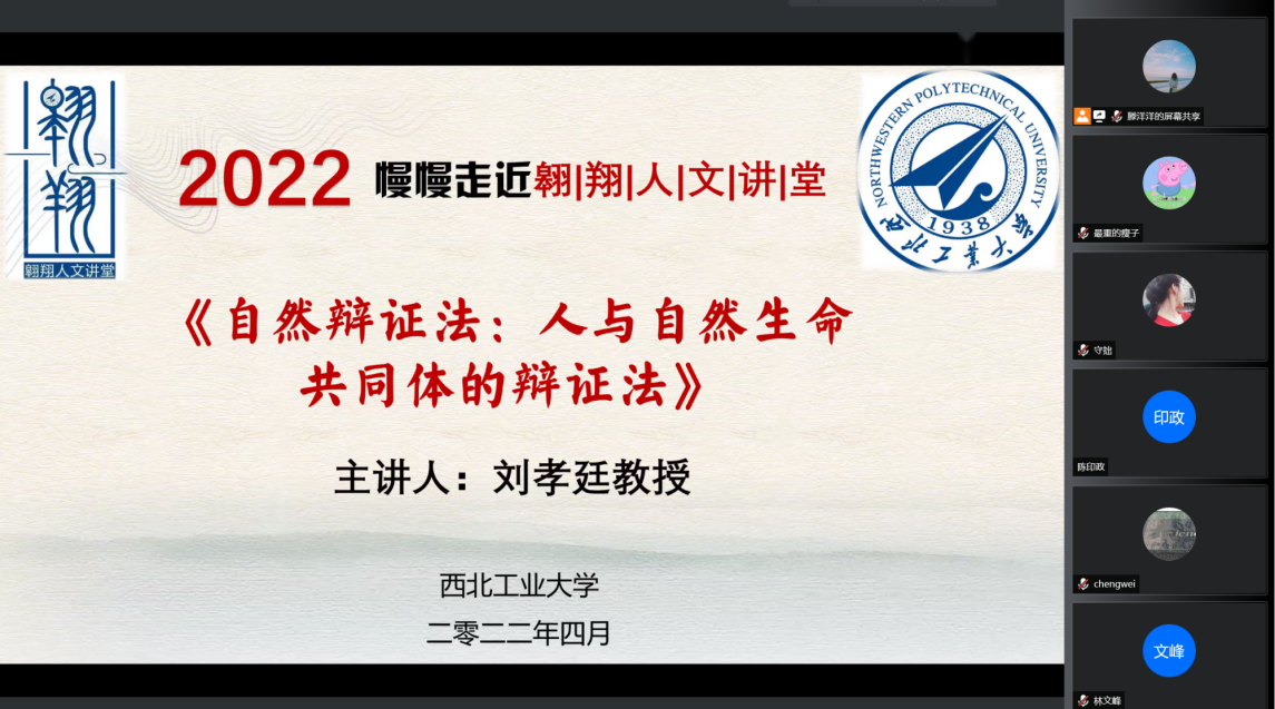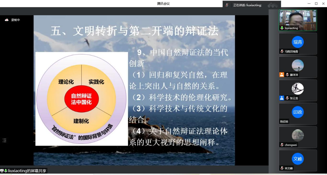 “翱翔人文讲堂”,通过腾讯会议平台直播的形式为我们带来了一场主题为《自然辩证法:人与自然生命共同体的辩证法》的精彩讲座。中国自然辩证法研究会理事长何鸣鸿、清华大学刘立教授、工程与社会发展专业委员会副主任、安徽大学王金柱教授、国产直播