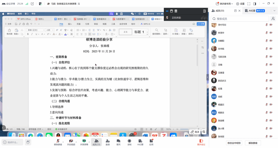 学院2025级博士生张姝瑾、张肖丽、王提滢、杨江楠四位同学作为分享嘉宾,结合自身申博实战经历,从自我评估、材料准备、考核应对、心态调整四大核心维度带来了深入浅出的经验分享。