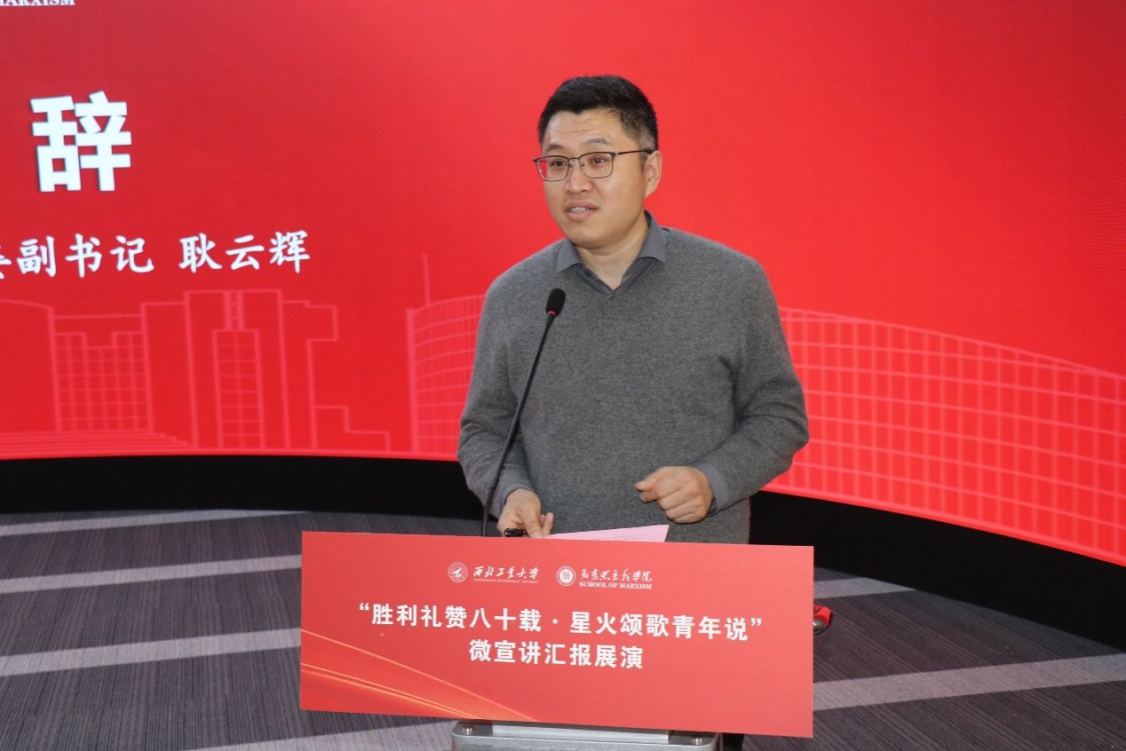 党委副书记耿云辉向到场的各校嘉宾与师生表示诚挚欢迎,阐明本次微宣讲展演以抗战胜利八十周年为契机,搭建校际交流平台、培育青年理论宣讲人才的核心初衷。