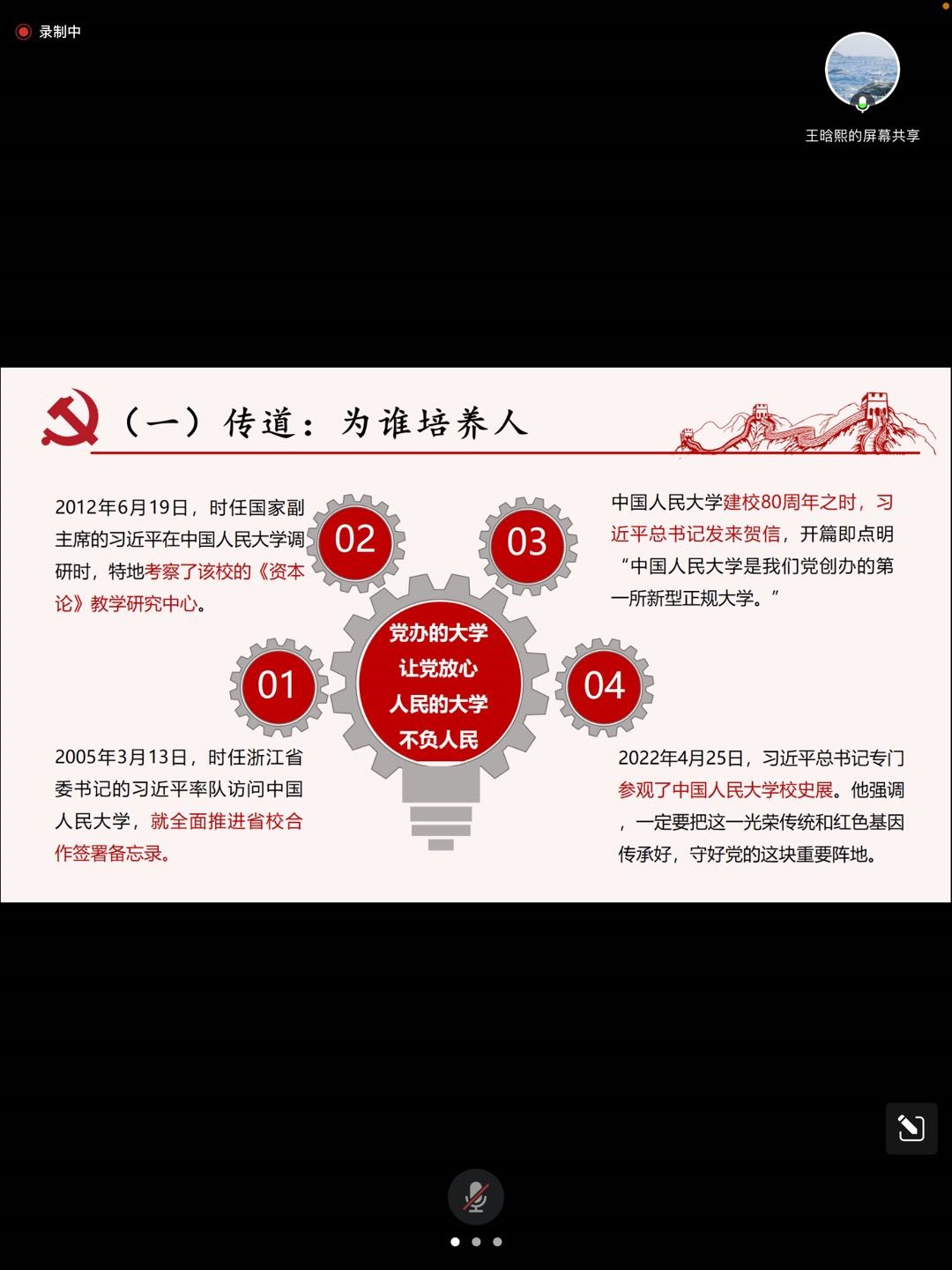 接下来,由学院博士生杨璐静同学进行导读。内容共分为四个部分进行阐释分析。第一部分,坚持立德树人。2022年4月25日上午中共中央总书记、国家主席、中央军委主席习近平来到中国人民大学考察调研。习近平总书记在中国人民大学的讲话中强调:“要坚持党的领导,坚持马克思主义指导地位,坚持为党和人民事业服务,落实立德树人根本任务,传承红色基因,扎根中国大地办大学,走出一条建设中国特色、世界一流大学的新路。”第二部分,传承红色基因。红色基因是一种革命精神的传承。红色,象征光明,凝聚力量和引领未来。瑞金、井冈山、遵义、延安、西柏坡,无一例外因为“红色”而书写了历史。“红色基因”是中国共产党人的精神内核,是中华民族的精神纽带。习近平总书记强调,我国有独特的历史、独特的文化、独特的国情,建设中国特色、世界一流大学不能跟在别人后面依样画葫芦,简单以国外大学作为标准和模式,而是要扎根中国大地,走出一条建设中国特色、世界一流大学的新路。中国人民大学从陕北公学成立之初就鲜明提出要培养“革命的先锋队”,到新中国成立之初提出培养“万千建国干部”,到改革开放新时期提出培养“国民表率、社会栋梁”,再到新时代提出培养“复兴栋梁、强国先锋”,始终不变的是“为党育人、为国育才”,展现了“党办的大学让党放心、人民的大学不负人民”的精神品格。希望中国人民大学落实立德树人根本任务,传承红色基因,让听党话、跟党走的信念成为人大师生的自觉追求。第三部分,推动教育发展。用六个“办好”揭示了推动教育发展的关键要义。办好高校,首先要有一支优秀教师队伍;办好高校,一定要重点办好思政课;办好高校,一定要注重传承;办好高校,不仅要注重自然科学和科学技术的教育,而且要同样重视哲学社会科学的教育和发展;办好高校,要发挥哲学社会科学在融通中外文化、增进文明交流中的独特作用;办好高校,要求青年学生做社会主义核心价值观的坚定信仰者、积极传播者、模范践行者。第四部分,创办一流大学。加快推进教育现代化、建设教育强国、办好人民满意的教育,努力培养担当民族复兴大任的时代新人,培养德智体美劳全面发展的社会主义建设者和接班人。