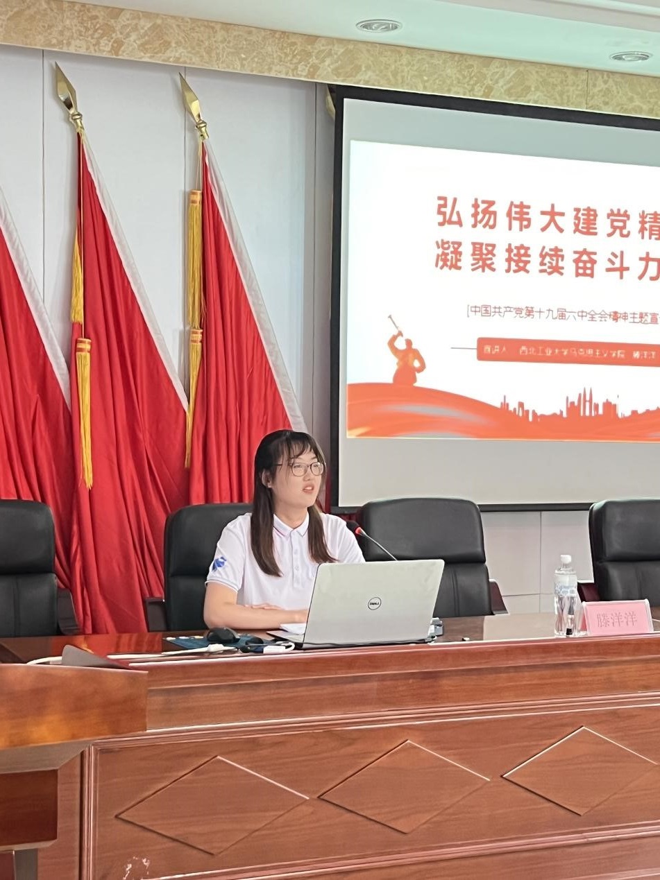 硕士研究生侯若云以《学习十九届六中全会精神,书写城固壮美画卷》为主题,以宏大的历史观系统回顾了中国共产党百年奋斗征程,深入解读了伟大建党精神的科学内涵,共同领会学习贯彻党的十九届六中全会精神的重大意义。结合习近平总书记关于社区工作的重要论述,对标新时代共产党员的标准要求,以开国上将萧克、抗疫英雄为榜样,生动刻画了“平常时候看得出来、关键时刻站得出来、危难关头豁得出来”的合格党员应有的样子。借助城固县社区为群众办实事、做好事的鲜活实例,激励社区党员要继续鼓起“闯”的勇气、激发“拼”的劲头、永葆“实”的干劲,把党的十九届六中全会精神落到实处,在新时代新征程上赢得更加伟大的胜利和荣光。