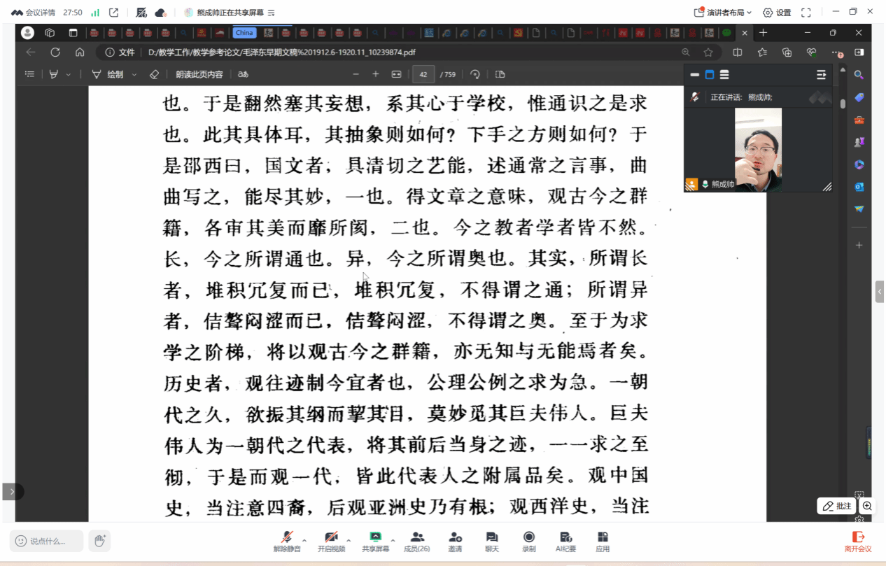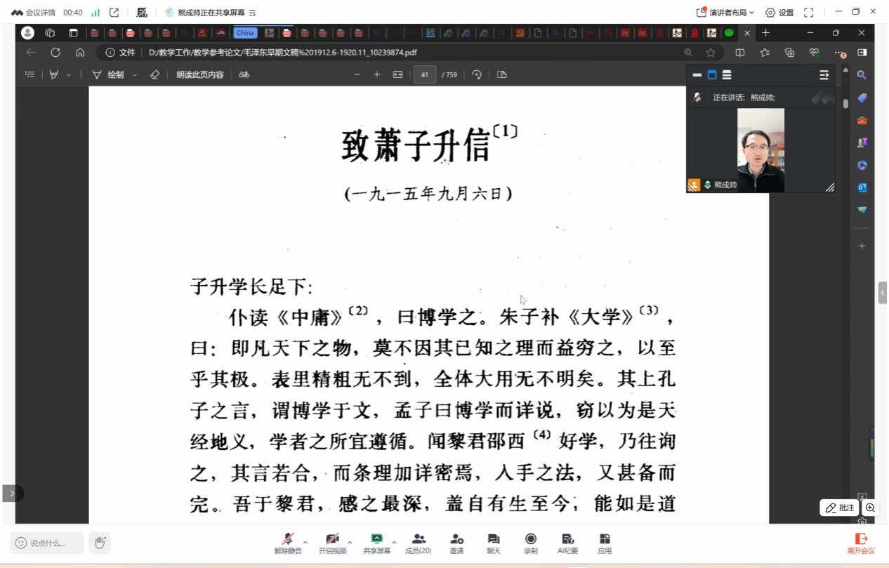 本次读书会通过对一封毛泽东早期的信札的细致研读,使同学们得以窥见青年毛泽东博采中西、注重实学、探求“公理公例”“大本大原”问题的治学理念与思想渊源,并以此重新思考自身的学习方法与学习观念。读书会氛围轻松活跃,会议最后,熊老师作为本科生班主任也对同学的假期阅读生活提出了建议,提醒同学们假期注意安全、持续学习,度过一个快乐、充实的假期。