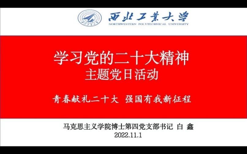 博士生第四党支部线上开展了“献礼党的二十大 强国有我新征程”主题党日活动,支部15名成员参加会议,会议由支部书记白鑫同志主持。