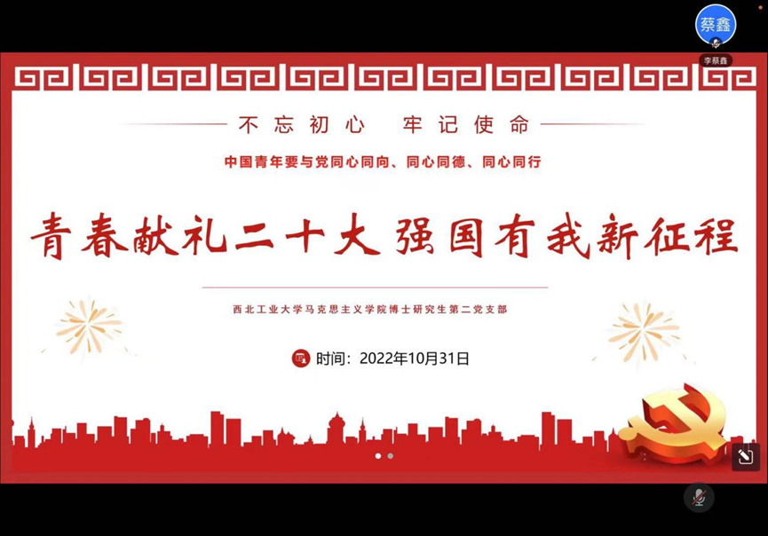 博士生第二党支部在线召开了“青春献礼二十大 强国有我新征程”的主题党日活动。主题党日以集体学习和集体讨论相结合的形式,组织党员学习党的二十大报告全文,接受思想滋养,凝聚青春力量。博士生第二党支部全体成员参加了会议。会议由支部书记李水主持,各位党员首先就党的二十大报告开展了集体学习,随后分别讨论了各自的学习体会。