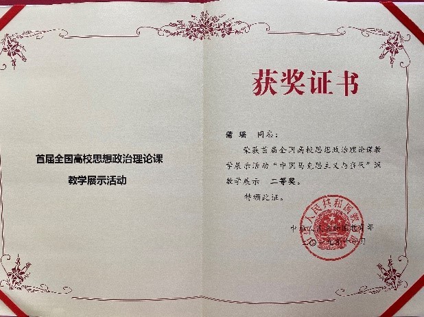 A few days ago, the certificate of “the first teaching exhibition activity for ideological and political theory course in national colleges and universities” was issued by the Ministry of Education. The good news was that two teachers of School of Marxism have got this honor, with He Miao and Pu Yao winning the first prize and the second prize respectively. This is another great achievement that School of Marxism has made in the national teaching activities for ideological and political theory course.