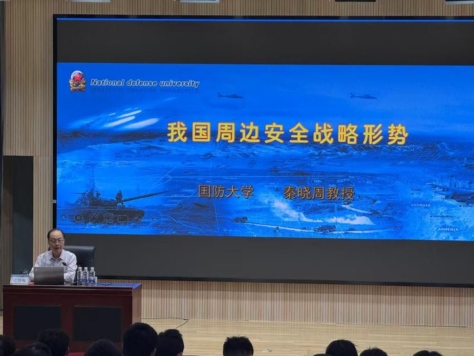 师生作国家安全专题讲座。他聚焦大国竞争态势与地区安全热点问题,深入剖析了当前复杂多变的国际格局。他指出,越是在和平发展时期,越要强化忧患意识和底线思维,做到居安思危,唯有如此才能持续巩固国防安全,保障国家长治久安与可持续发展。随后,秦晓周教授从我国五大战区的战略部署和使命任务出发,结合丰富的历史案例与国际经验,系统分析了各战略方向面临的形势与挑战,并强调在应对安全风险时必须统筹运用政治、经济、外交、科技、军事等综合手段。他认为,面对当前变乱交织的国际环境,战略定力与灵活应变能力相辅相成、缺一不可,只有始终保持清醒头脑和科学判断,才能在纷繁复杂的全球变局中牢牢把握战略主动,有效维护国家主权、安全与发展利益。
