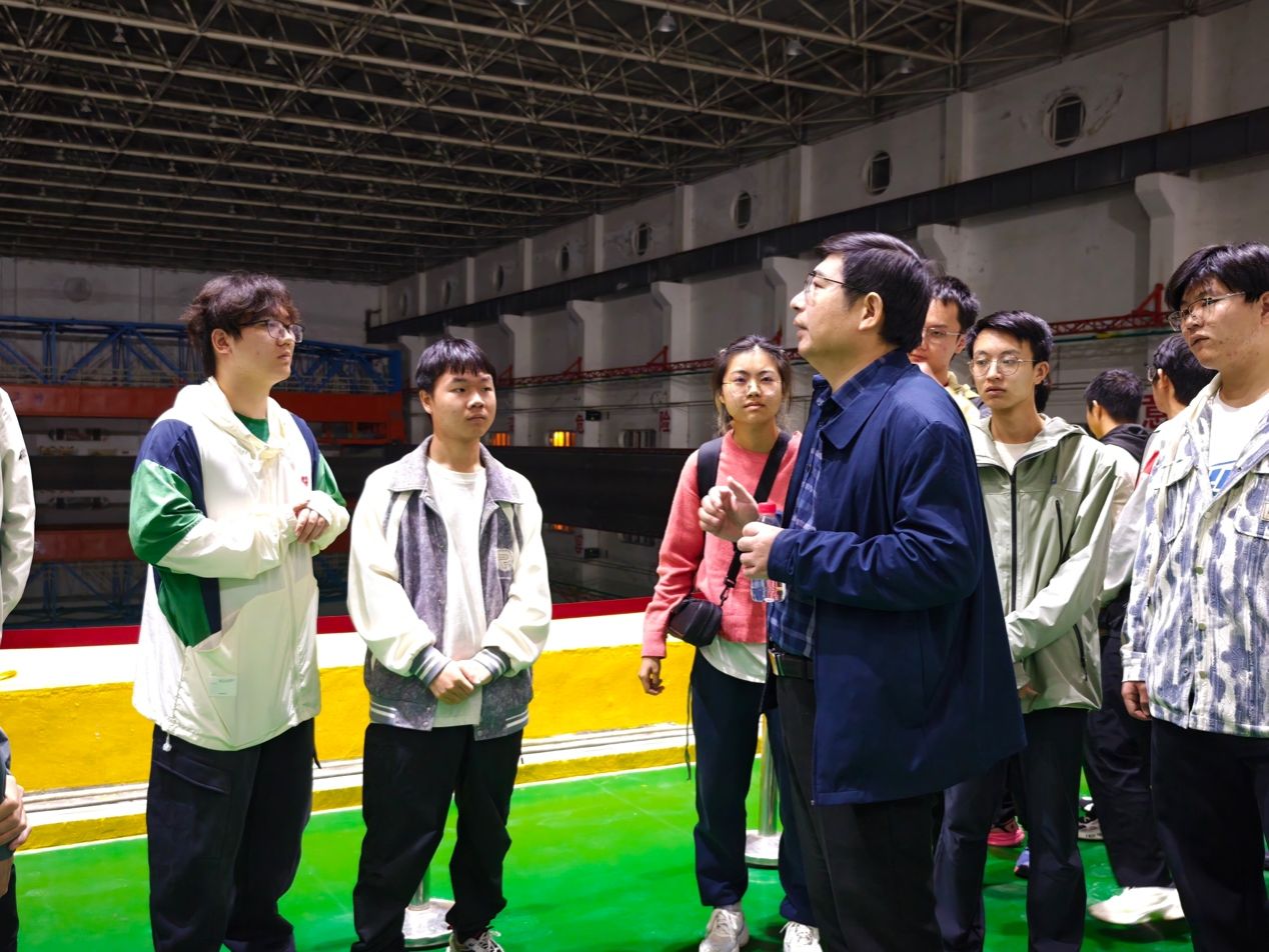 曾教授首先介绍了航海学院的历史沿革、专业设置及研究方向,阐述了优秀校友的突出贡献与代表性成果。随后,他带领同学们参观了翱翔重点实验室,详细讲解了仪器设备与模型展项的相关数据及研发历程,使在场每位师生对海上测试、水下攻防、深海对抗等领域形成了具体而深刻的认识。在课程的互动环节中,同学们不仅结合自身研究兴趣向曾教授请教,还就人才培养、技术革新等议题与老师进行了深入探讨。曾教授对每位同学的提问均给予肯定并详尽解答,勉励大家勤学精进、献身国防。