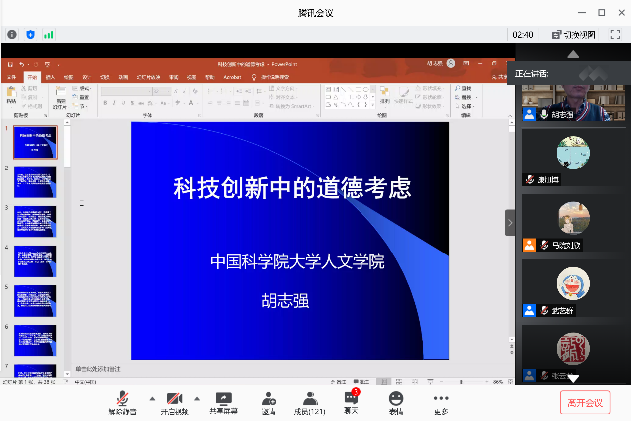2020年11月13日晚上19:30,中国科学院大学人文学院教授、中国科学院哲学研究所学术委员会副主任委员、《自然辩证法通讯》杂志主编胡志强教授应邀作客国产直播 翱翔名家讲堂,通过腾讯会议平台直播的方式,为国产直播 师生带来了一场主题为《科技创新中的道德考虑》的精彩讲座,国产直播 及来自全国高校近200名师生参加了讲座。本次翱翔名家讲堂由国产直播 党委学生工作部主办,国产直播 承办,国产直播 副院长张云龙教授主持。