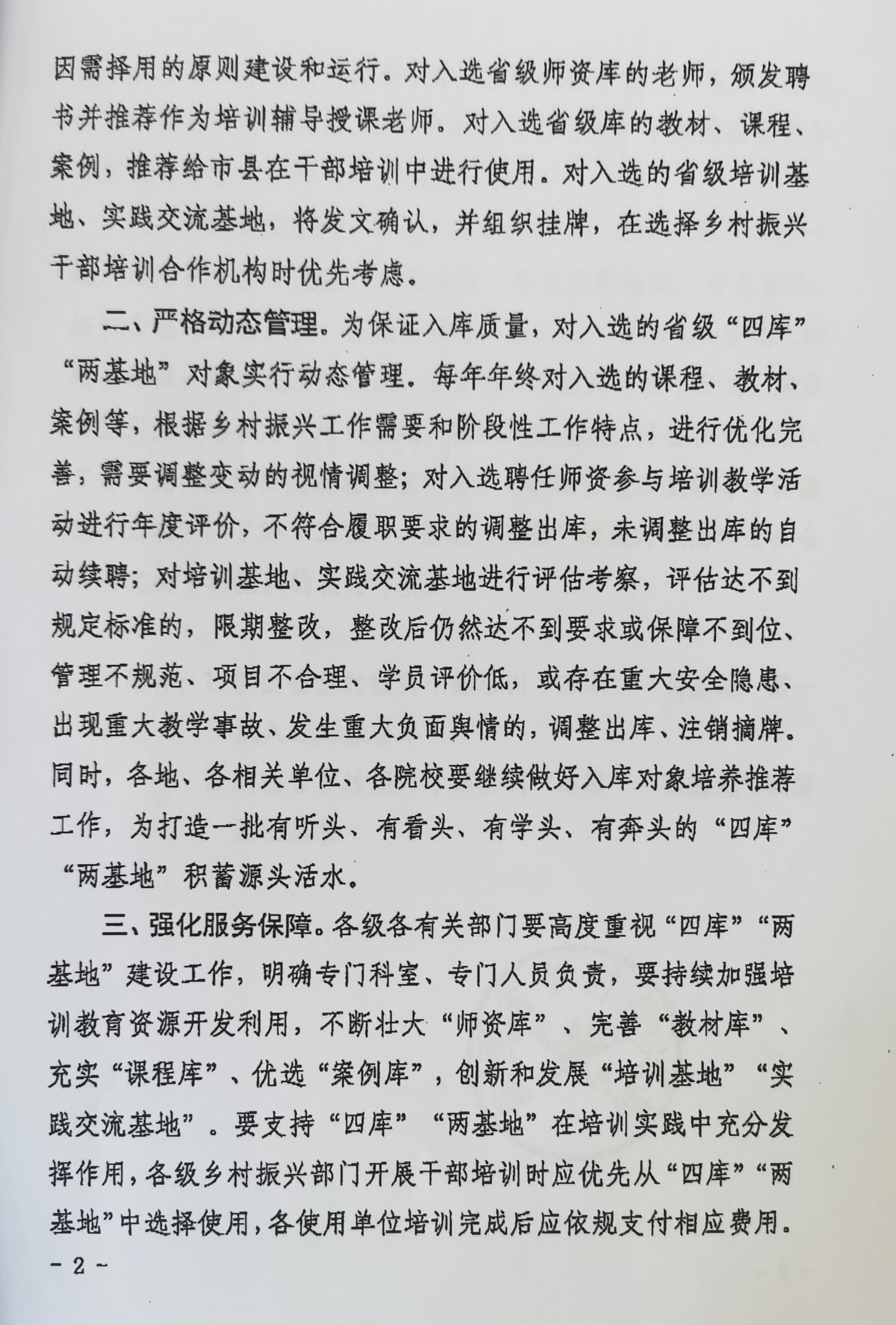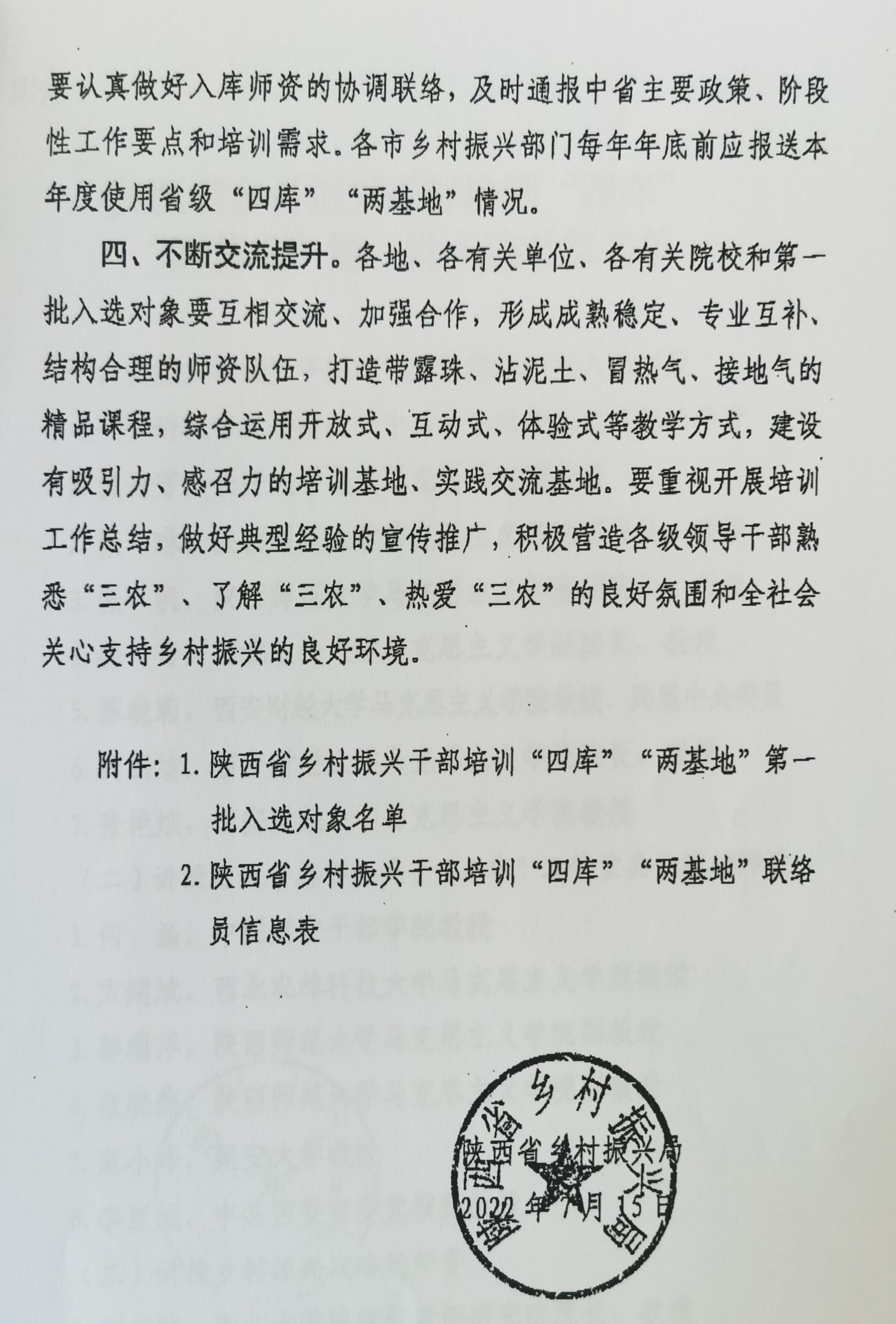 为进一步加强乡村振兴干部培训保障能力,提升乡村振兴干部培训质量效益,更好服务巩固拓展脱贫攻坚成果同乡村振兴有效衔接工作,陕西省乡村振兴局建立了省级乡村振兴干部培训“师资库”“教材库”“课程库”“案例库”和“培训基地”“实践交流基地”(以下简称“四库”“两基地”)。