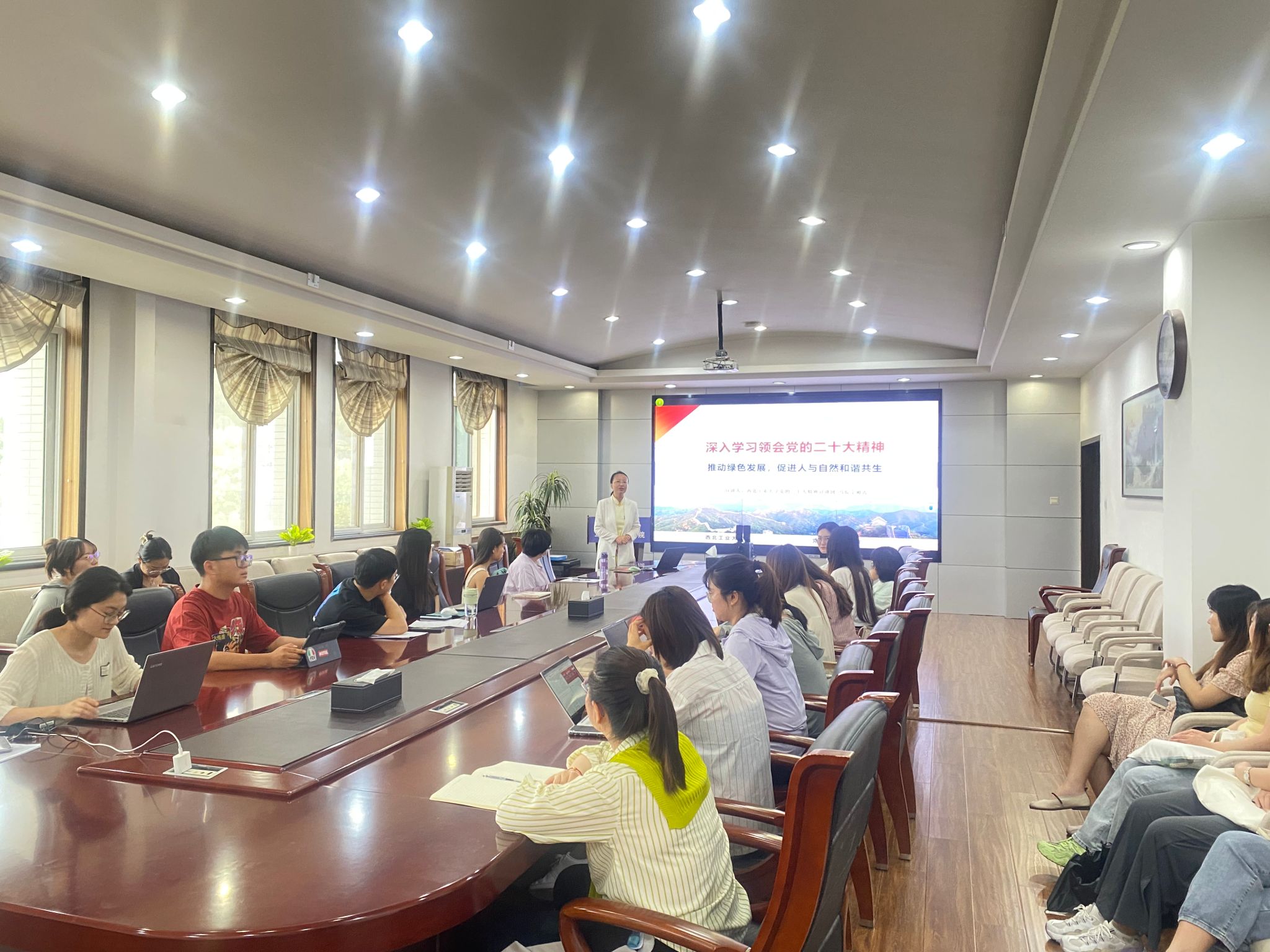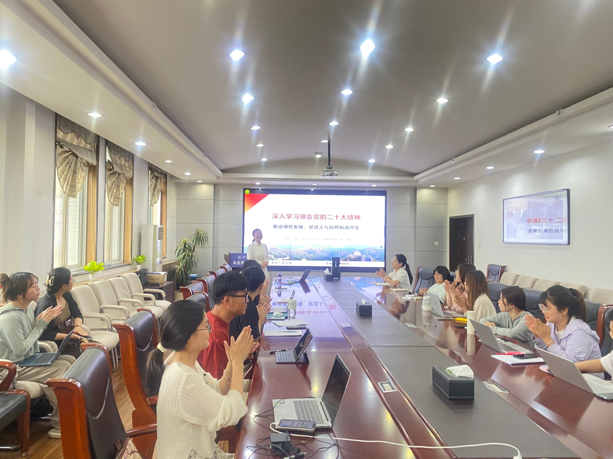 其次宁老师阐释了应怎样推动绿色发展,促进人与自然和谐共生,引用马恩文集原文“自然界,就它不是人的身体而言,是人的无机的身体,人靠自然界生活。”给同学们讲述生态的重要性,由此引出对未来发展、新能源等的思考,表示要推动绿色发展必须牢牢把握高质量发展这个首要任务。之后,宁老师根据自身前往新能源企业调研的经历向大家讲述高质量发展的重要性,也借此为同学们介绍了当下一些新能源公司如宁德时代、比亚迪,以及一些发展前景较好的企业和学校,为对就业困惑的同学指点迷津。