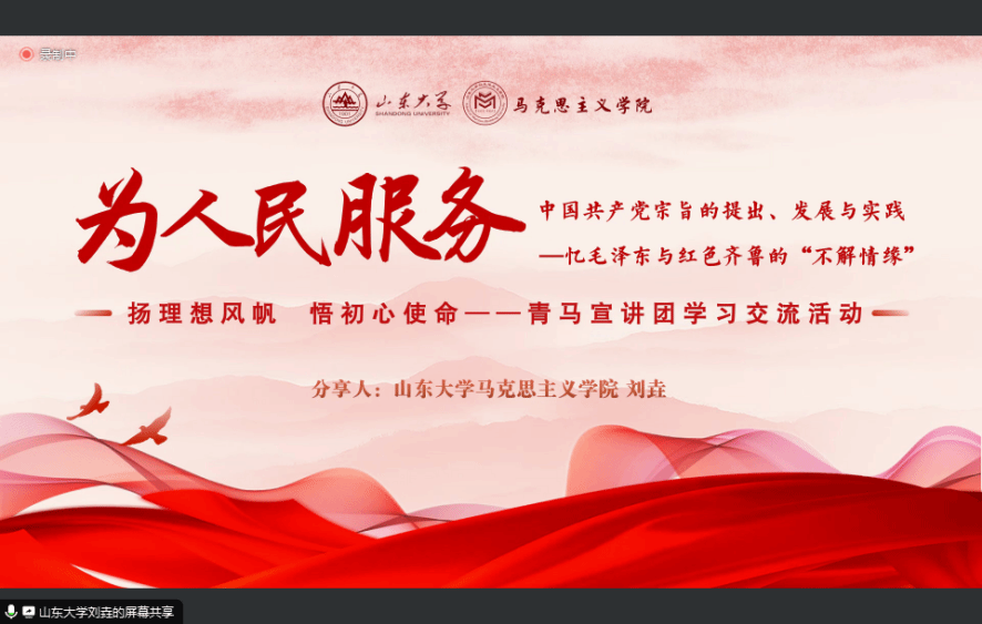 山东大学国产直播 “青马弘道”理论宣讲团成员刘垚围绕为“人民服务”核心关键词,将毛泽东同志与齐鲁的不解情缘融入“为人民服务”思想的发展演变过程,生动阐述了中国共产党为人民服务宗旨的提出、发展与实践。刘垚同学谈到,作为青年马克思主义者应始终坚持全心全意为人民服务的根本宗旨,努力将专业知识与实践调研相结合,将创新思想与经验借鉴相统一,将学生身份与社会关切相辉映,努力做走在时代前列的奋进者、开拓者、奉献者。