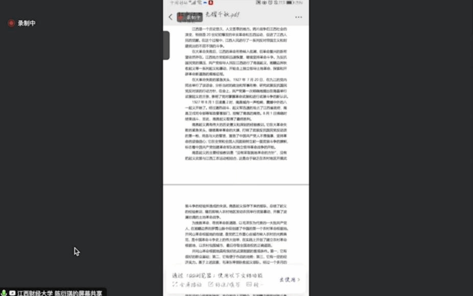 江西财经大学江西青马宣讲团成员蓝愉带来以《江西:三大红色摇篮》为题的宣讲。蓝愉同学讲述了以八一南昌起义而闻名的南昌、中华苏维埃共和国诞生地瑞金、中国革命根据地井冈山三大红色摇篮,真实再现了江西在革命年代的突出贡献,带领与会师生回顾伟大革命斗争历程,体会革命先烈不怕牺牲、勇往直前的爱国主义精神,了解江西在中国革命史中的重要历史地位,深刻体悟党的艰辛奋斗史和党的精神谱系。