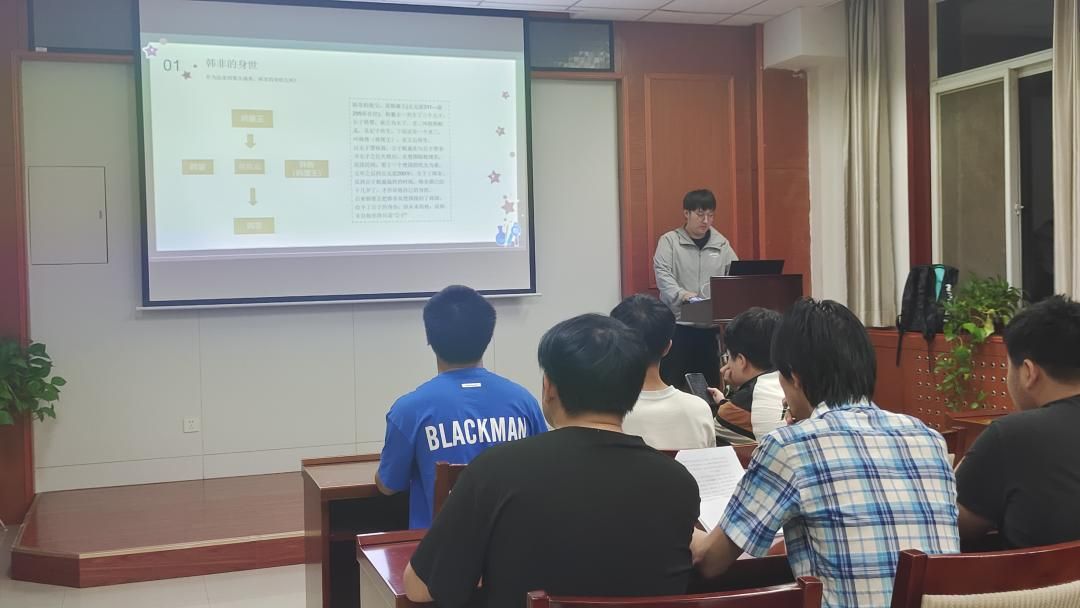 紧接着,社长张博文分享了法家集大成者—韩非子的思想,他介绍了韩非子的身世背景,讲述了秦东出灭六国而首灭韩国的原因以及韩非子关于“法”“术”“势”的思想,并深入分析了韩非子的治国理念以及大一统思想。前社长行增对分享活动做了点评,同时也结合《史记》中对法家代表人物商鞅的记载,谈了自己的想法和理解。此外,社团其他成员也充分地表达了自己的观点。