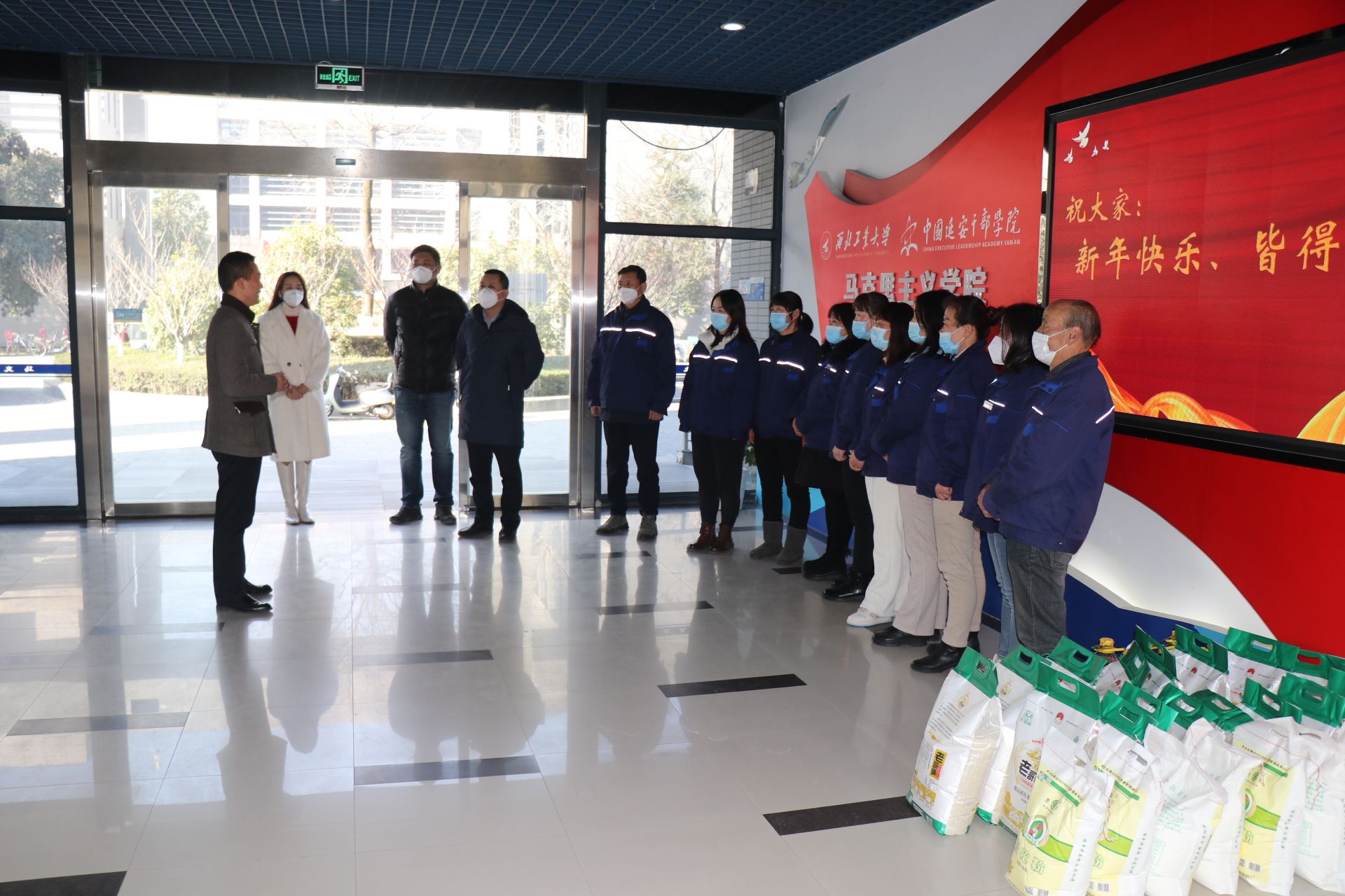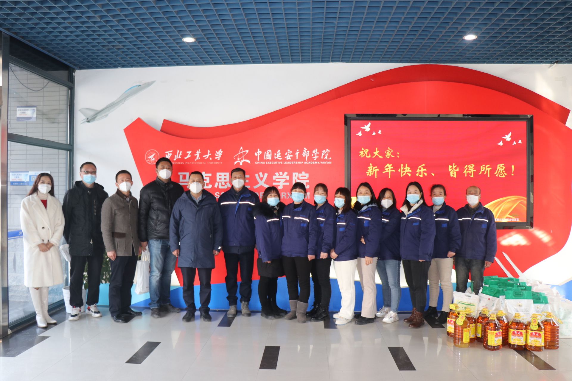 党委副书记(主持工作)蒲传新一行代表学院慰问在学院楼工作的物业人员,并代表全院师生表达感谢和新春问候。后勤集团物业服务中心主任羽渊、副主任周伟,马院院办主任郭雅楠等参加了慰问活动。
