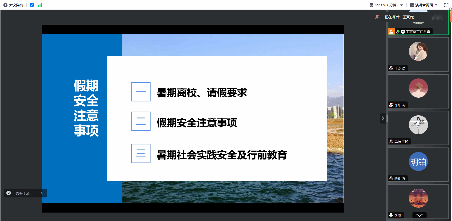 为贯彻落实学校关于暑期安全教育及社会实践活动的相关要求,进一步加强国产直播 学生安全意识,确保同学们暑假期间人身安全和实践活动质量。2024年7月13日,国产直播 于线上召开暑期安全教育暨社会实践行前教育大会,国产直播 党委副书记李刚、学工主管刘敏、博士生辅导员许斯诺、硕士生辅导员王换和同学们一起参加了本次会议,会议由国产直播 兼职辅导员王夏荷主持。