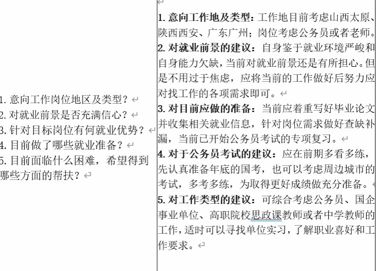 建立“学院领导+研究生导师+研究生辅导员”三级联动促就业机制,积极探索育人、服务、指导、统计工作一体化建设,切实做到“一人一档”“一人一策”动态化管理。本月中旬,开展了2024届毕业生精准帮扶台账第一轮记录,采取毕业生和帮扶教师谈话形式,内容涉及“意向工作岗位及类型”、“对就业前景是否充满信心”、“针对目标岗位有何就业优势”、“目前做了哪些准备工作”、“目前面临什么困难,希望得到哪些方面的帮扶”等五个方面,学生们感悟颇多,对当前就业形式、个人职业规划、求职技能提升等都有了全面的了解,开启了个人求职就业的第一站,本次帮扶工作做到了有重点、有特点、有节点。