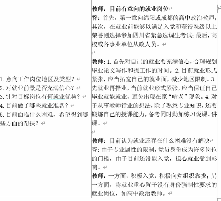 研职有方,岗位“精准推”。毕业生和帮扶教师座谈结束后,辅导员收集了每个学生的求职意向,发挥“宣传员”作用,采取“一人一策”,并建立微信群,依托全媒体平台,及时筛选、整合“国家24365大学生就业服务平台”、“国产直播
