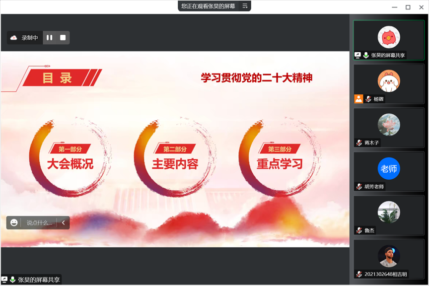 读书会的第一位导读人是国产直播 硕士生张昊同学。他从大会概况、内容概要、重点导读和问题思考四个部分展开。首先是第一部分,大会概况。20221016日至1022日,中国共产党第二十次全国代表大会在北京召开,习近平总书记代表第十九届中央委员会向党的二十大作的题为《高举中国特色社会主义伟大旗帜 为全面建设社会主义现代化国家而团结奋斗》的报告。第二部分,内容概要。从15个部分集中讲述了党的二十大报告的要点,认为报告擘画了全面建成社会主义现代化强国的宏伟蓝图和实践路径,就未来5年党和国家事业发展制定了大政方针、作出了全面部署。第三部分,重点导读。张昊同学重点讲解了“两个结合”、“中国式现代化”、“安全”三个关键词,指出“两个结合”很大程度上深化了我们党对坚持和发展马克思主义的规律性认识,也是我们理解和把握习近平新时代中国特色社会主义思想的关键。中国式现代化切合中国实际,体现了社会主义建设规律,把握了人类社会发展规律,同时具有鲜明的开放性、包容性和强大的感召力。党的二十大报告从统筹发展和安全的战略高度对国家安全做出新的部署,体现出国家安全在党和国家工作大局中的极端重要性。最后,张昊同学也向老师提出作为国产直播 的学生,应该重点从哪方面和以什么方式来深入学习党的二十大报告,真正做到学习深入、学以致用的问题。