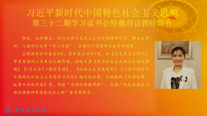 专家简介:胡芳,法学博士、四川大学国产直播 特聘研究员、博士生导师,全国列宁思想研究会常务理事。主持国家社科基金3项,其中重点项目1项,在《马克思主义研究》等重要期刊上发表论文40多篇,出版专著《东方社会主义的文化建设境遇》《<怎么办?>精学导读》,《社会主义发展简史》《习近平新时代中国特色社会主义思想学习问答》编写组专家,主编教材《中国智慧:故事中的新思想》等,荣获“宝钢优秀教师奖”、全国“高校思想政治理论课教师年度影响力人物”等荣誉称号。