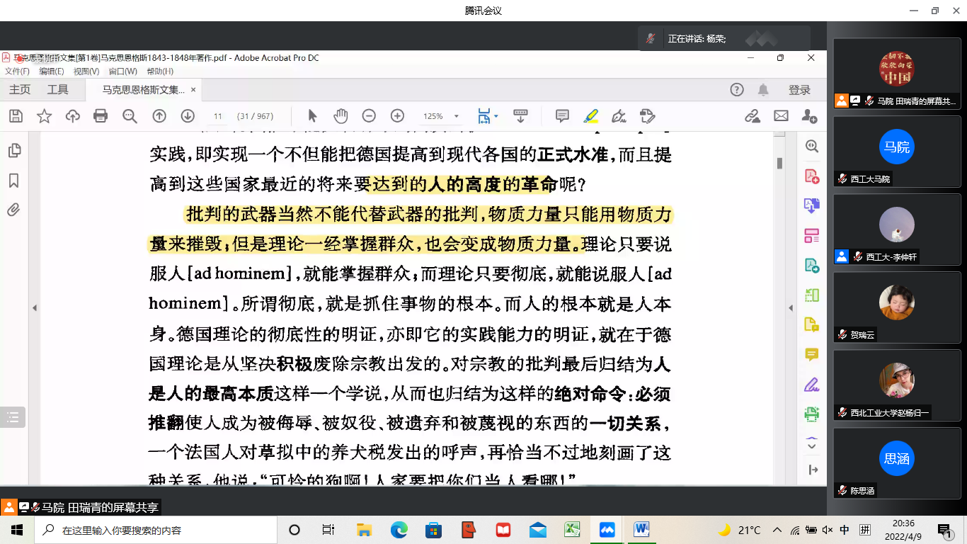 教授丁社教、张云龙、准聘副教授杨荣与青年学子们一同阅读马克思的经典著作《黑格尔法哲学批判》导言,解读马克思关于人类解放的思想。读书会由马院助理教授张起梁主持,学院党委副书记李刚全程参与读书会。