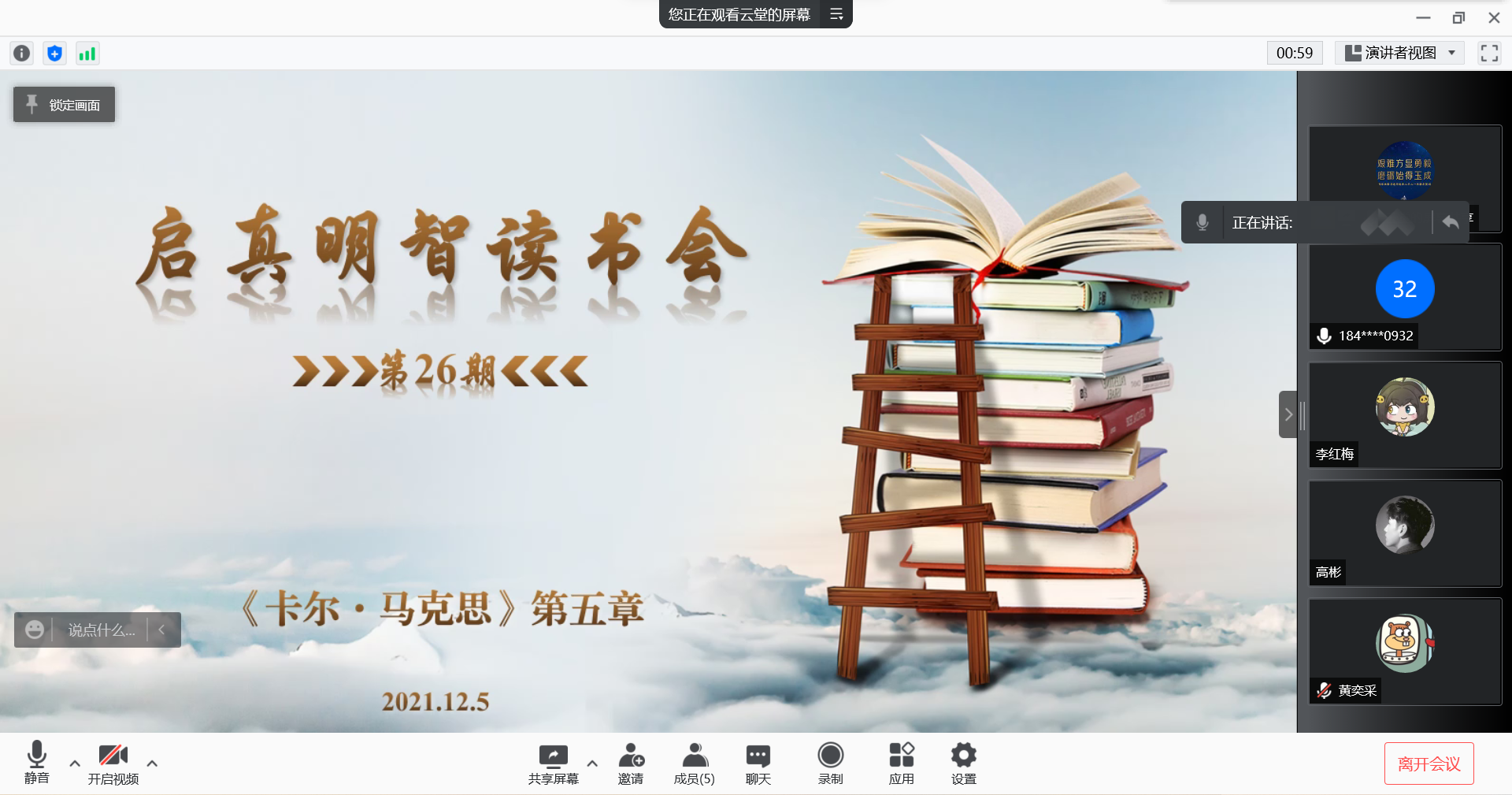 张云龙教授、青年教师杨荣、吕天择、杨永强受邀与同学们一起交流学习,读书会由硕士生田瑞青主持。