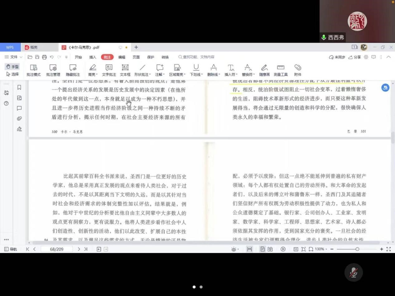 首先,硕士生李仲轩、李红梅、李潇、王菲等先后阅读书本内容,表达了对所阅读内容的理解,并提出了一些针对性的问题,三位老师对学生提出的问题进行了解答。师生们针对马克思在法国巴黎生活的时代背景及其对马克思思想形成的影响、实证主义和观念论的对立、法国和德国思想环境的对比、法国空想社会主义是马克思思想的来源等方面进行了深入的交流。