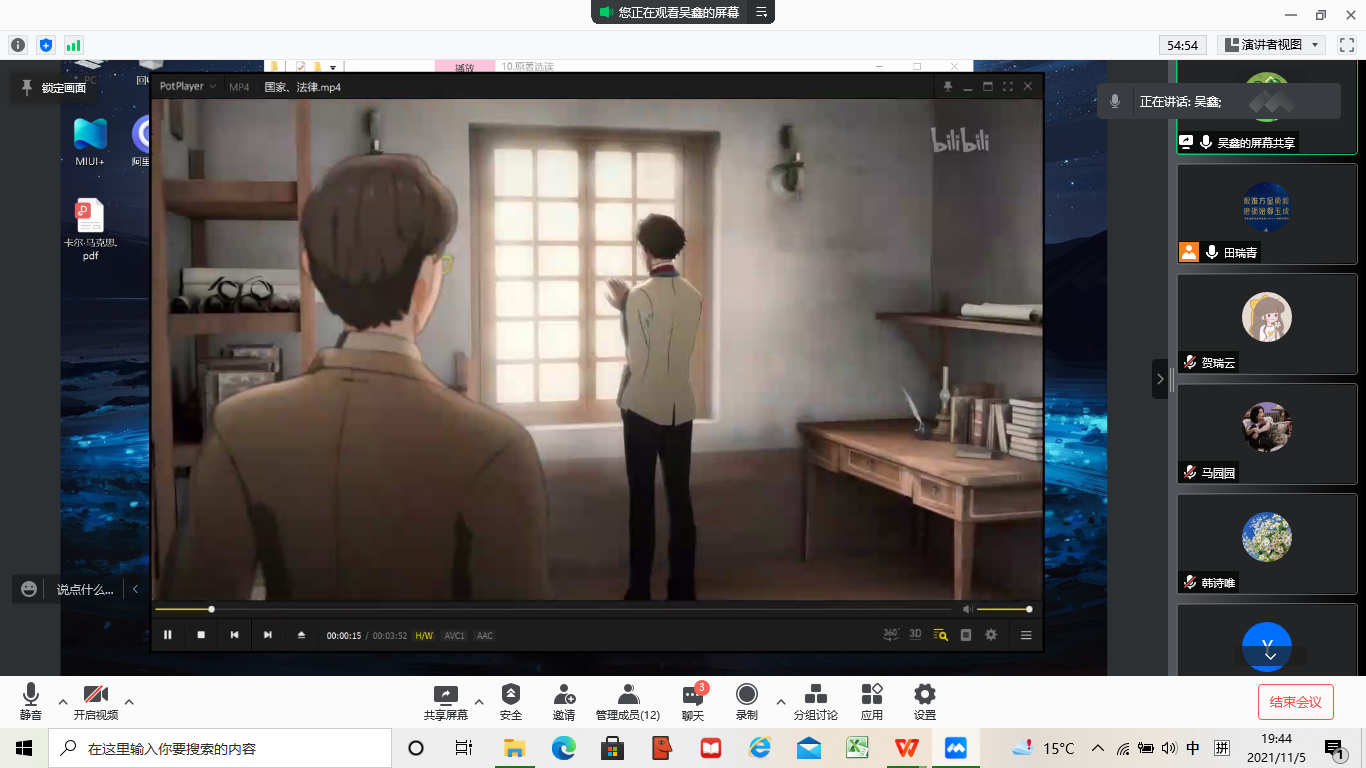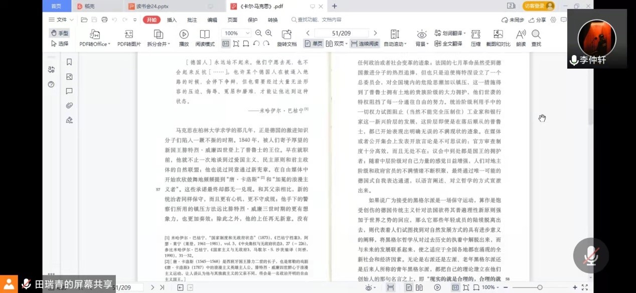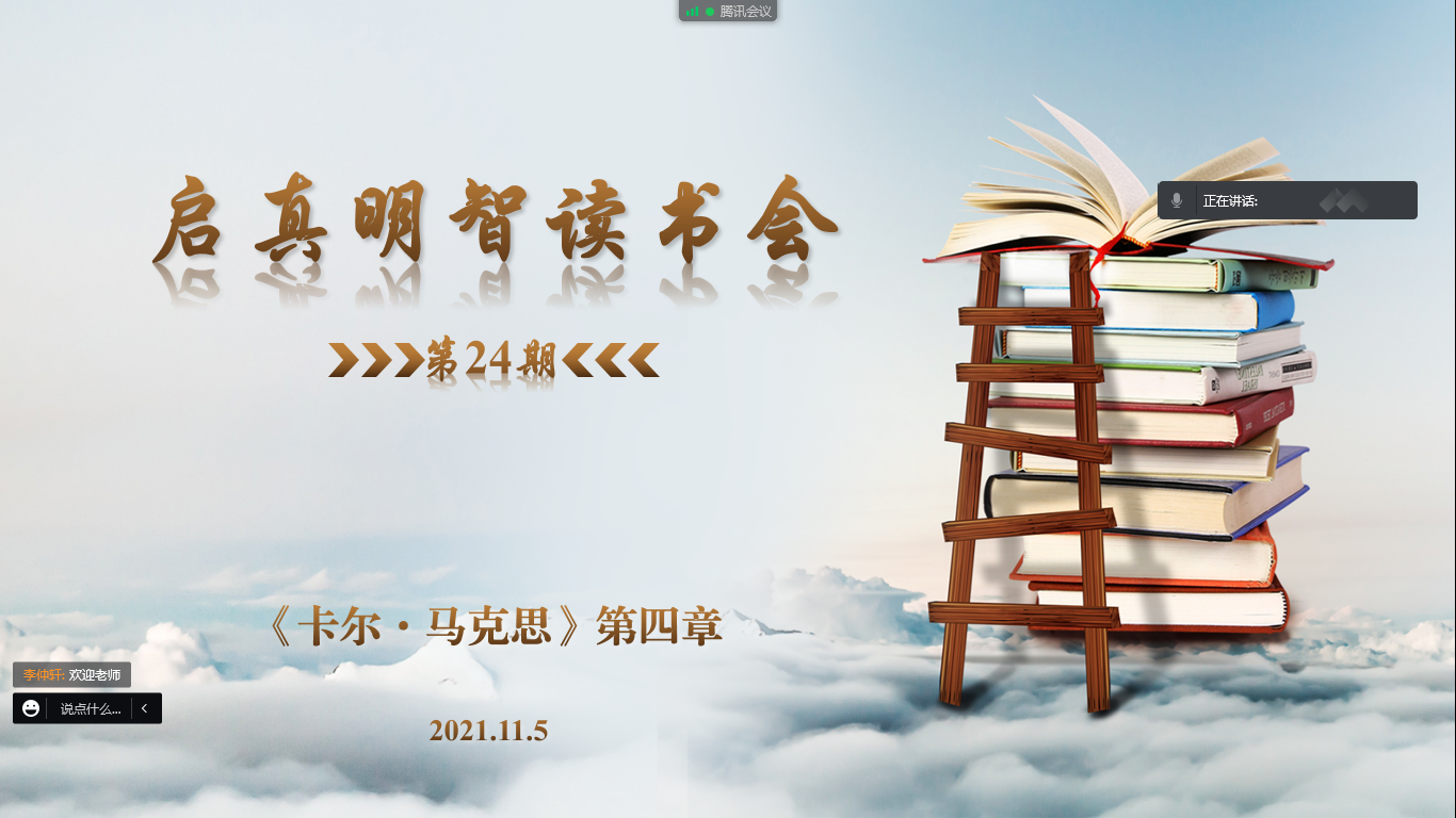 2021年11月5日,启真明智读书会第24期通过腾讯会议顺利举行,本期读书会阅读内容为以赛亚·伯林所著《卡尔·马克思:生平与环境》第四章的内容,国产直播 国产直播 教授张云龙,助理教授吴鑫、杨永强参加读书会,与同学们交流学习,硕士生田瑞青主持本期读书会。