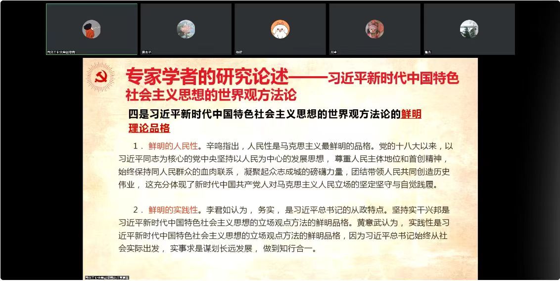 硕士生田宇洋同学进行导读。她首先通过总结专家学者的论述,介绍了习近平新时代中国特色社会主义思想的历史起点和逻辑起点,并阐述了国内国外的意义。第一部分是对这次讲话的重要意义进行解读,通过结合党的二十大报告,指出了这次讲话是统一全党思想意志行动、始终保持党的强大凝聚力、战斗力;是推动全党积极担当作为、不断开创事业发展新局面;是深入推进全面从严治党、以党的自我革命引领社会革命的必然要求。第二部分是全面准确把握主题教育的目标要求进行了自己的阐释。第三部分从明确领导责任;强化督促指导;注重统筹兼顾;加强宣传引导四个部分来论述如何切实加强对主题教育的领导。最后一部分对学习贯彻习近平新时代中国特色社会主义思想的目的进行总结,即对全党而言要提高运用党的创新理论的能力,对领导干部而言要坚持以身作则、以上率下。