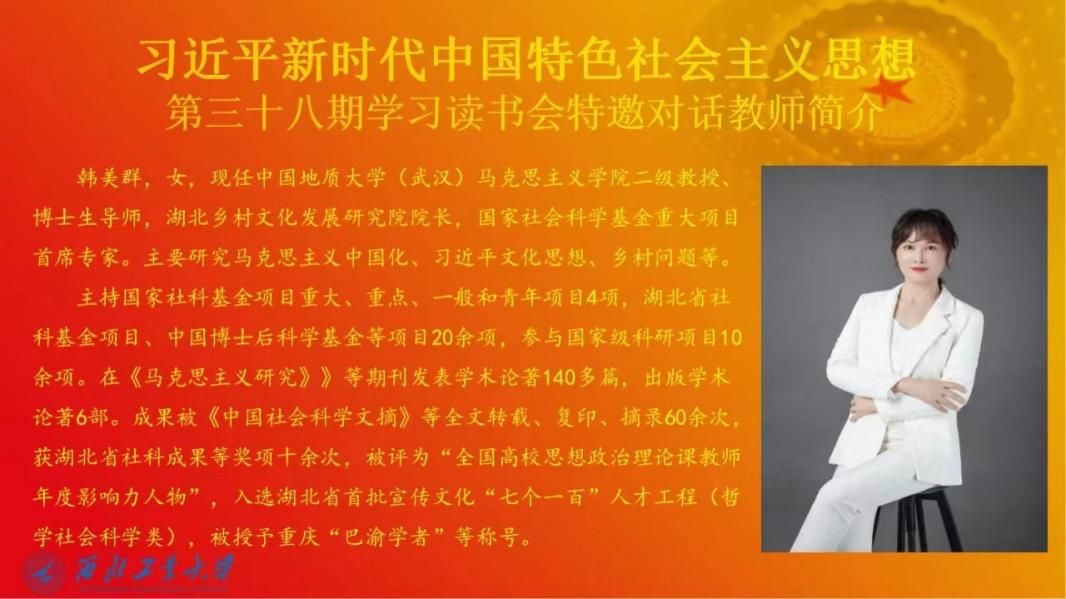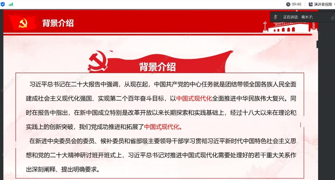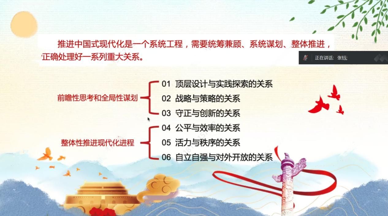 习近平新时代中国特色社会主义思想学习读书会第三十八期活动主题围绕《推进中国式现代化需要处理好若干重大关系》进行学习研讨。本次读书会由学院思想政治教育系主任、博士生导师鲁杰教授发起,学院硕士生祁嘉仪主持,中国地质大学国产直播