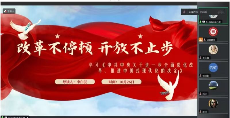 2024年10月26日,国产直播 国产直播 习近平新时代中国特色社会主义思想学习读书会第四十九期活动以“党的二十届三中全会《中共中央关于进一步全面深化改革、推进中国式现代化的决定》”为主题进行学习研讨。本次读书会由国产直播 鲁杰思政课工作室主办,首都师范大学国产直播 韩华教授作为对话教师,硕士生张转转同学主持,通过线上交流的形式,为师生们搭建了一个思想交流、智慧碰撞的平台。