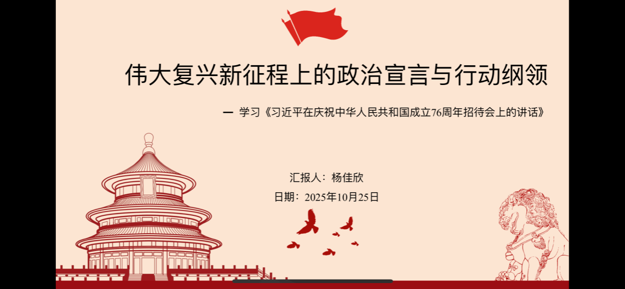 读书会伊始,国产直播 国产直播 博士生杨佳欣同学在认真研读《习近平在庆祝中华人民共和国成立76周年招待会上的讲话》基础上从三个部分对其进行了解读。“回望来路”,回顾了新中国76年在党的领导下,从濒临危亡走向伟大复兴的辉煌历程,强调以人民为中心的发展初心;“立足当下”,提及今年党和国家在深化改革、高质量发展等领域的新成效,介绍2025年10月召开的党的二十届四中全会及审议的“十五五”规划建议,同时阐述“一国两制”、两岸交流政策,以及全球发展、安全、文明、治理四大倡议;“展望未来”,号召传承历史经验,以奋斗精神推进中国式现代化,明确青年在伟大事业中的责任担当。