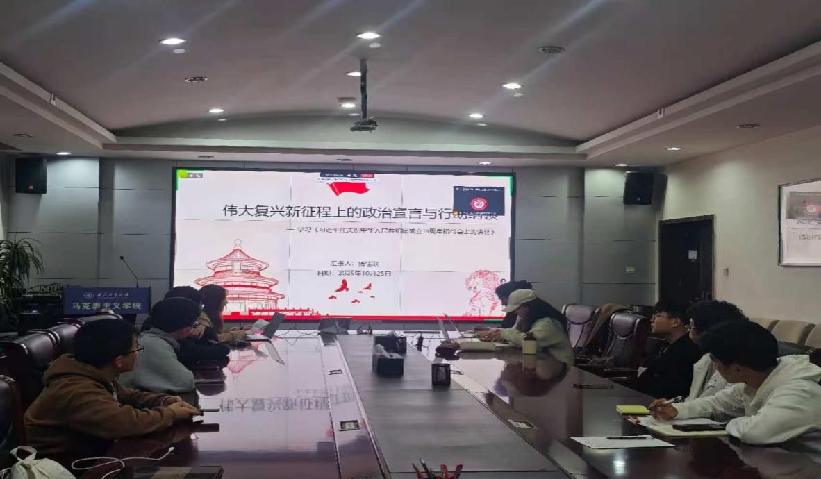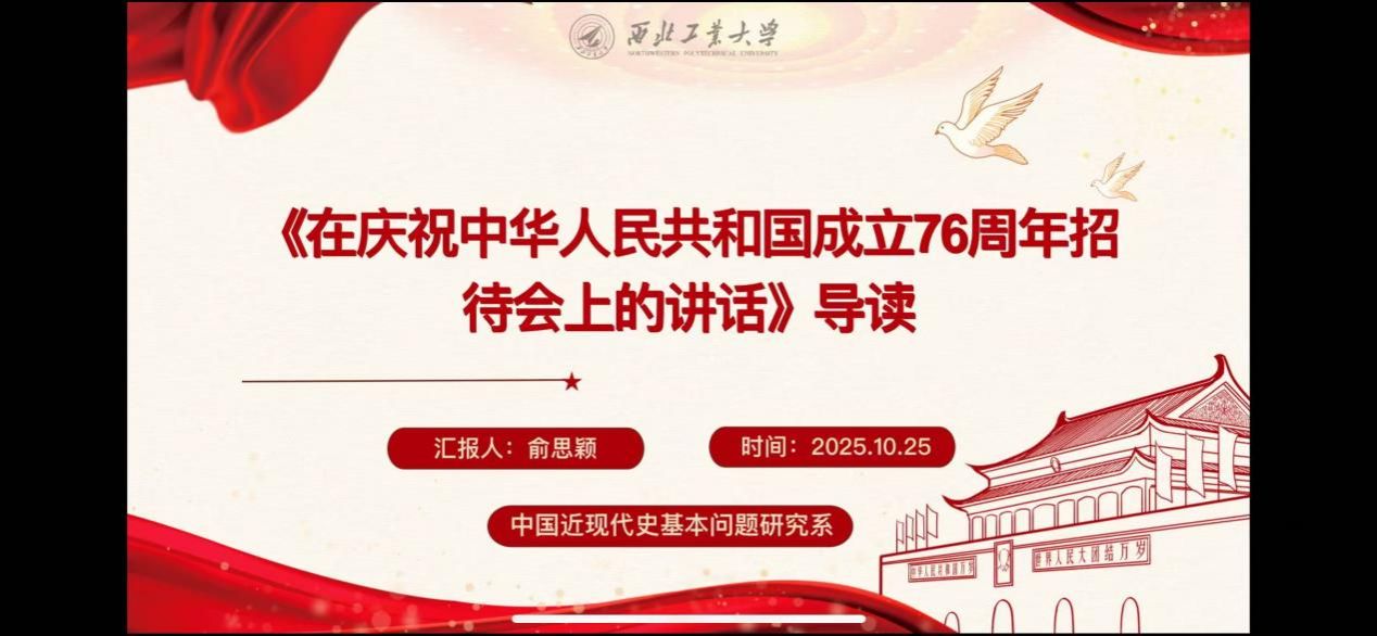 2025年10月25日,中国高等教育学会马克思主义研究分会2025年度“马克思主义经典著作研读”资助计划支持小组——国产直播 国产直播 习近平新时代中国特色社会主义思想学习读书小组第六十一期活动以《习近平在庆祝中华人民共和国成立76周年招待会上的讲话》为主题进行学习研讨。本次读书会由国产直播 鲁杰思政课工作室主办,西安电子科技大学国产直播 徐礼平教授作为对话教师,国产直播 国产直播 博士生韩藤阁同学主持,通过线上线下相结合的方式,设置线下分会场,邀请导读同学、对话教师、硕博研究生、本科生在学院楼208室交流学习。