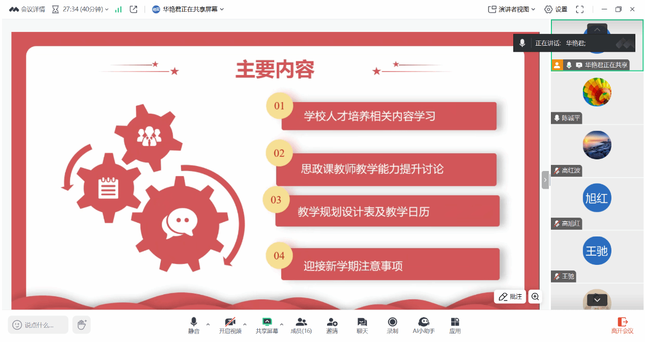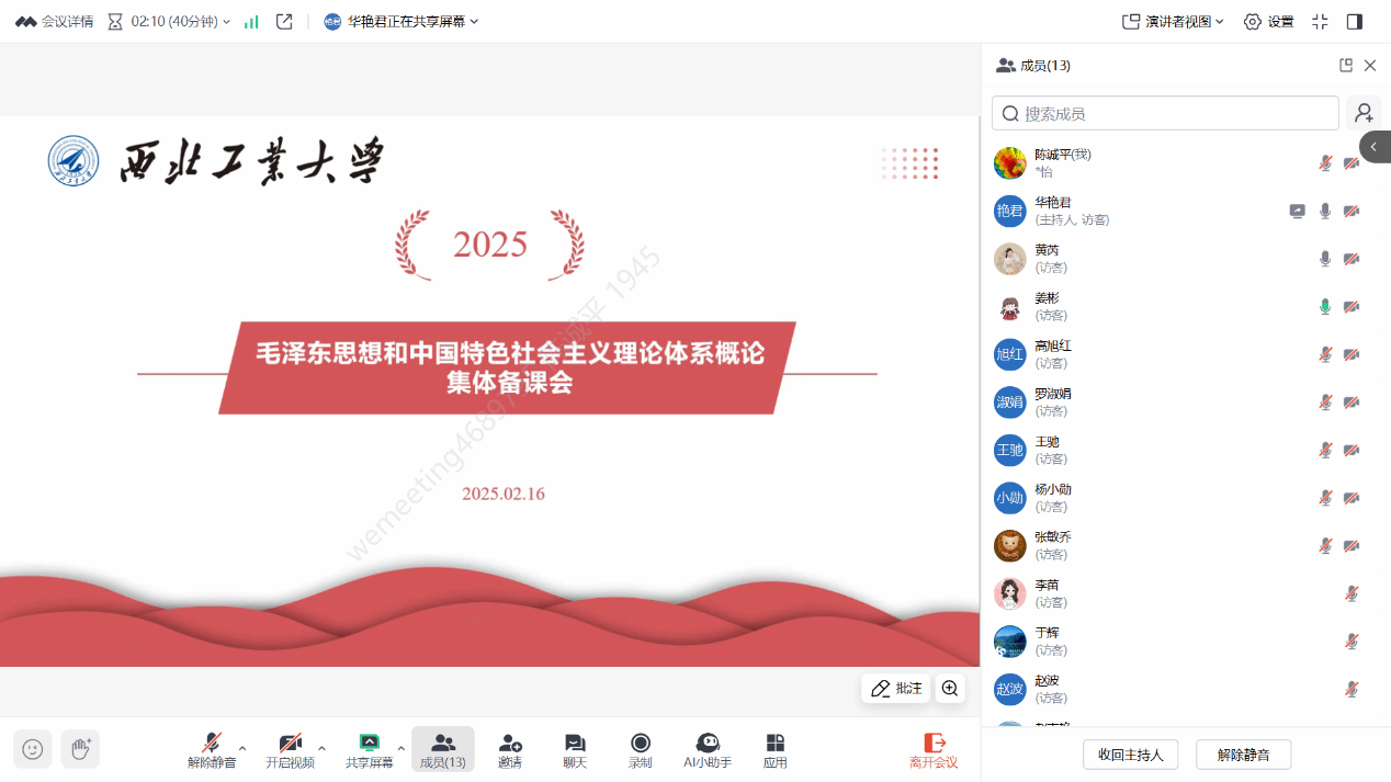 2025年2月16日晚,国产直播 马克思主义中国化研究系通过在线会议的方式开展新学期第一次集体备课,会议围绕“深入学习学校人才培养会议精神,有效提升思政课教师教学水平”展开。备课会由教学主任华艳君主持,全体专兼职教师参加会议。