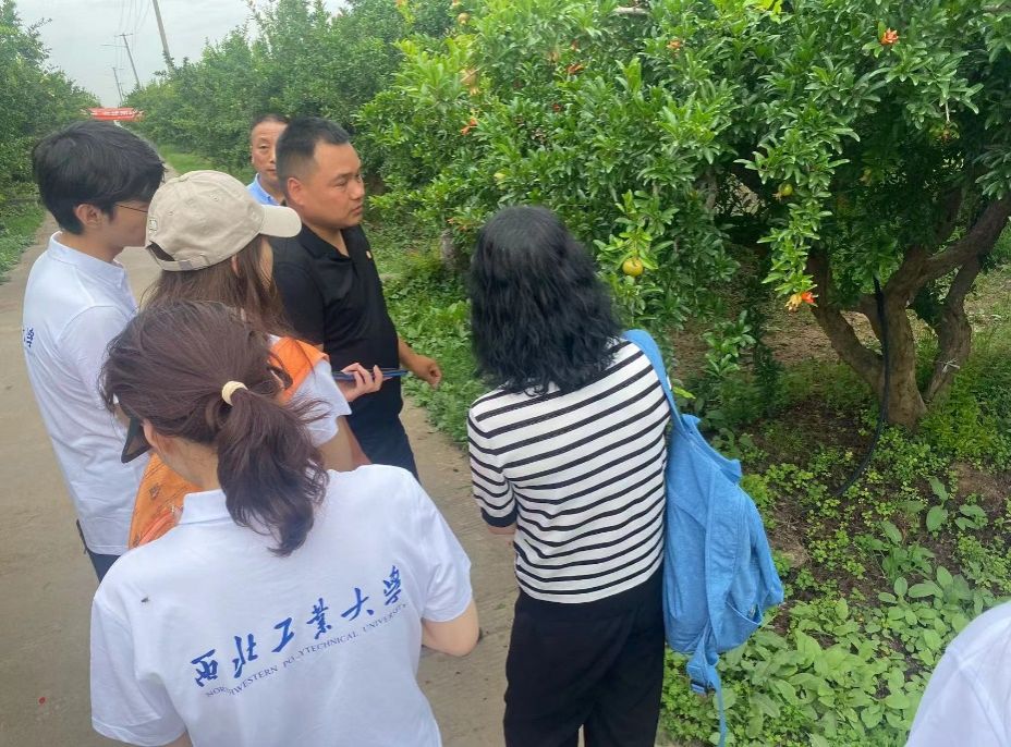 7月6日上午,实践队正式开启研学之旅的第二站,参观临潼区石榴红生态科技园,一同解锁数字技术引领下全面推进乡村振兴新模式。在园区工作人员引导下,实践队在临潼区石榴红生态科技园就养殖品种、大数据种植监测技术、产销模式进行参观和学习。临潼石榴种植系统是以古石榴为特色的农业文化系统,具有2000多年的历史,石榴园区运用天然的草资源、秸秆等对地表进行覆盖,稳定地温同时能增加营养,从而形成独特的生态系统,入选全国重要农业文化遗产名录。园区负责人盛情邀请成员们品尝石榴汁、欣赏石榴工艺品等一系列石榴附加产品,感悟到园区在“互联网+电商、产业分红”的农业农村现代化新模式下的有益尝试与丰硕成果。